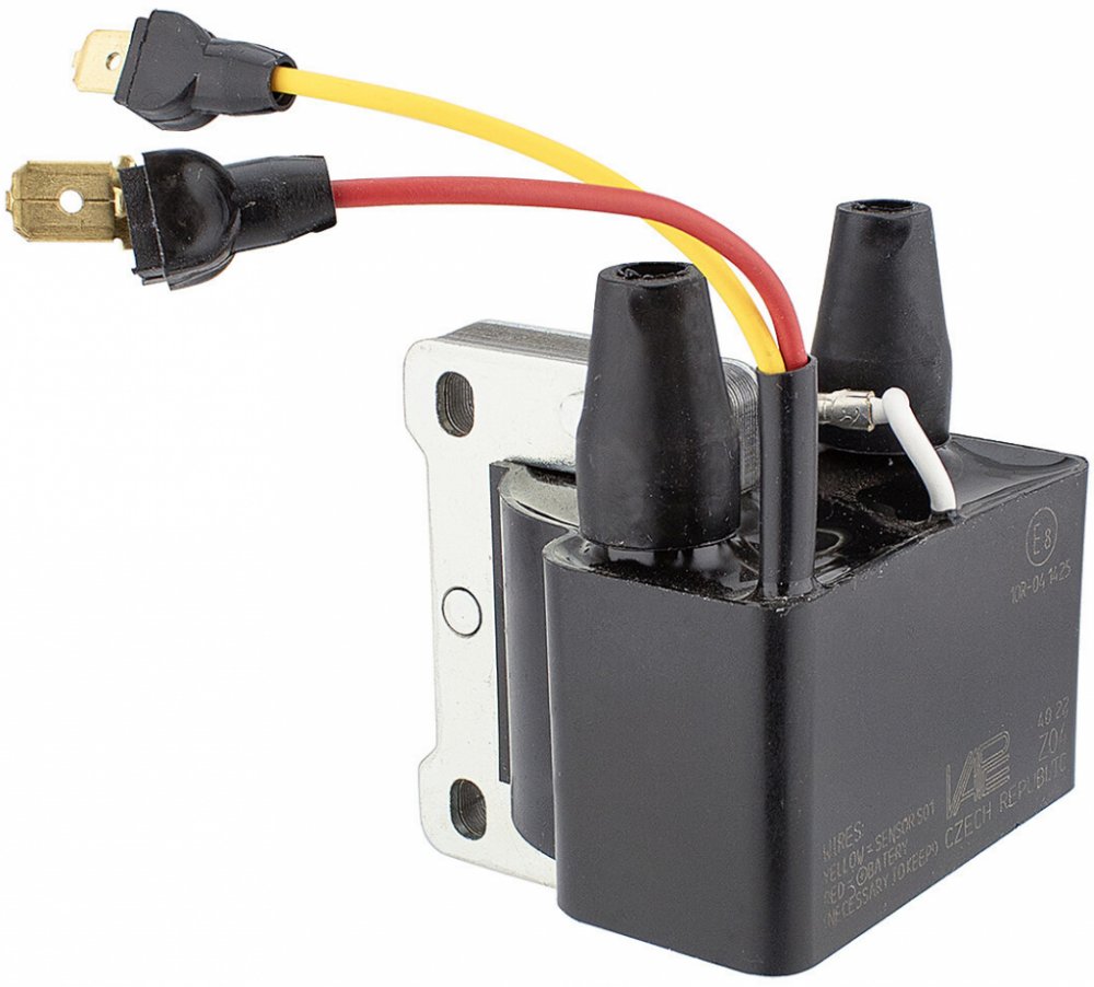Zapalovací cívka s integrovaným elektronickým spínačem, určená pro indukční zapalovací systémy napájené akumulátorem 12V a obsahující snímač polohy klikové hřídele. Obsahuje dva vysokonapěťové vývody. Je součástí sady MZ04. Není vhodná na Velorex - dynamostartér.