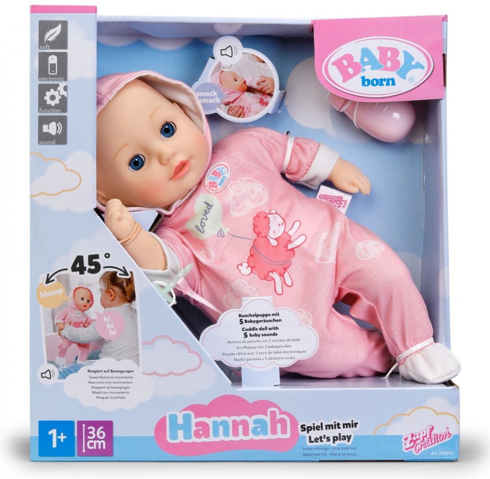 Hannah je vhodná pro děti už od 1 roku. Má měkké látkové tělíčko a 5 realistických interaktivních funkcí. Když jí podržíte v ústech lahvičku, uslyšíte roztomilé zvuky pití. Jemně jí stiskněte bříško a řekne „aja.“ Když ji nakloníte doleva nebo doprava, začne škytat nebo se smát.