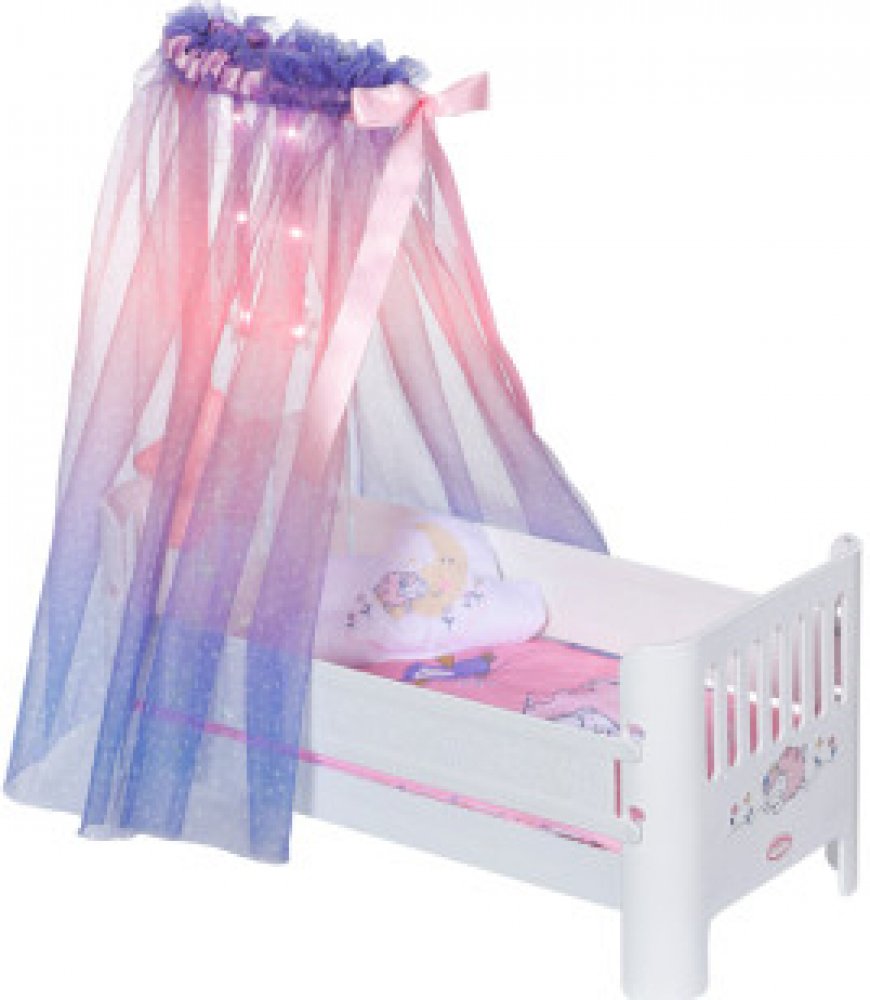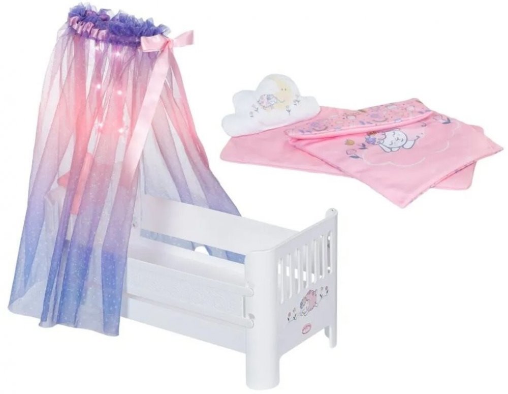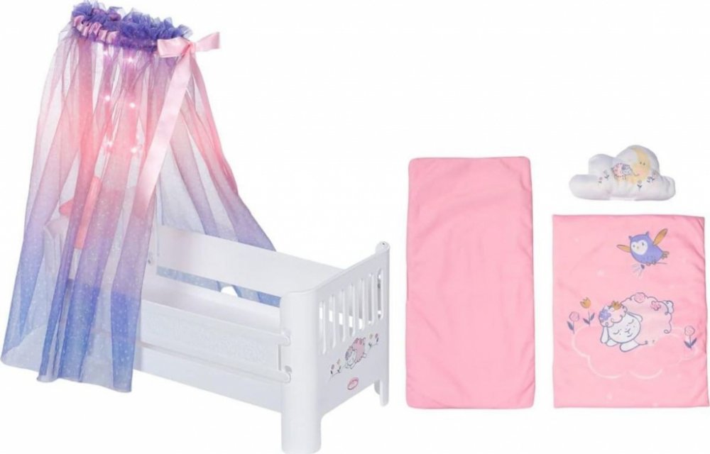 Nová postýlka Sladké sny pro panenky Baby Annabell je skvělým místem pro spinkání panenek. Krásná postýlka s měkkou přikrývkou a nadýchaným obláčkovým polštářkem hraje uklidňující melodii, která pomáhá panenkám usnout. Po stisknutí tlačítka se rozsvítí hvězdička, která osvětlí nebesa jako by to byla opravdová obloha. Baby Annabell se to moc líbí. Dobrou noc, Baby Annabell!• Originální doplněk pro ...