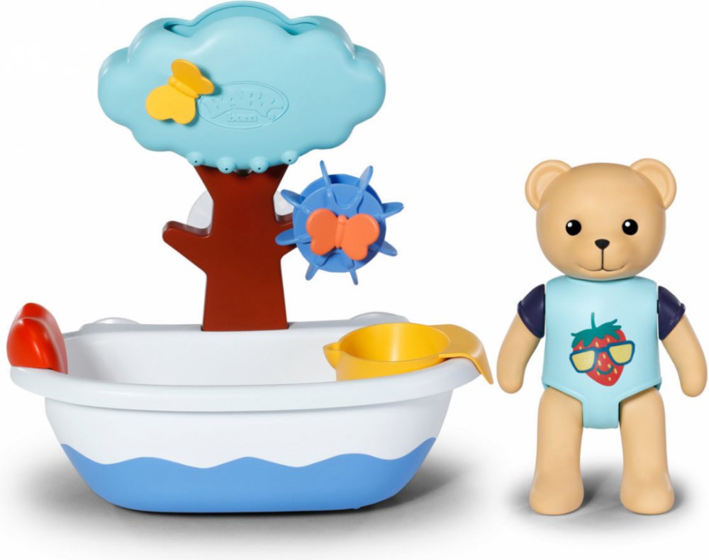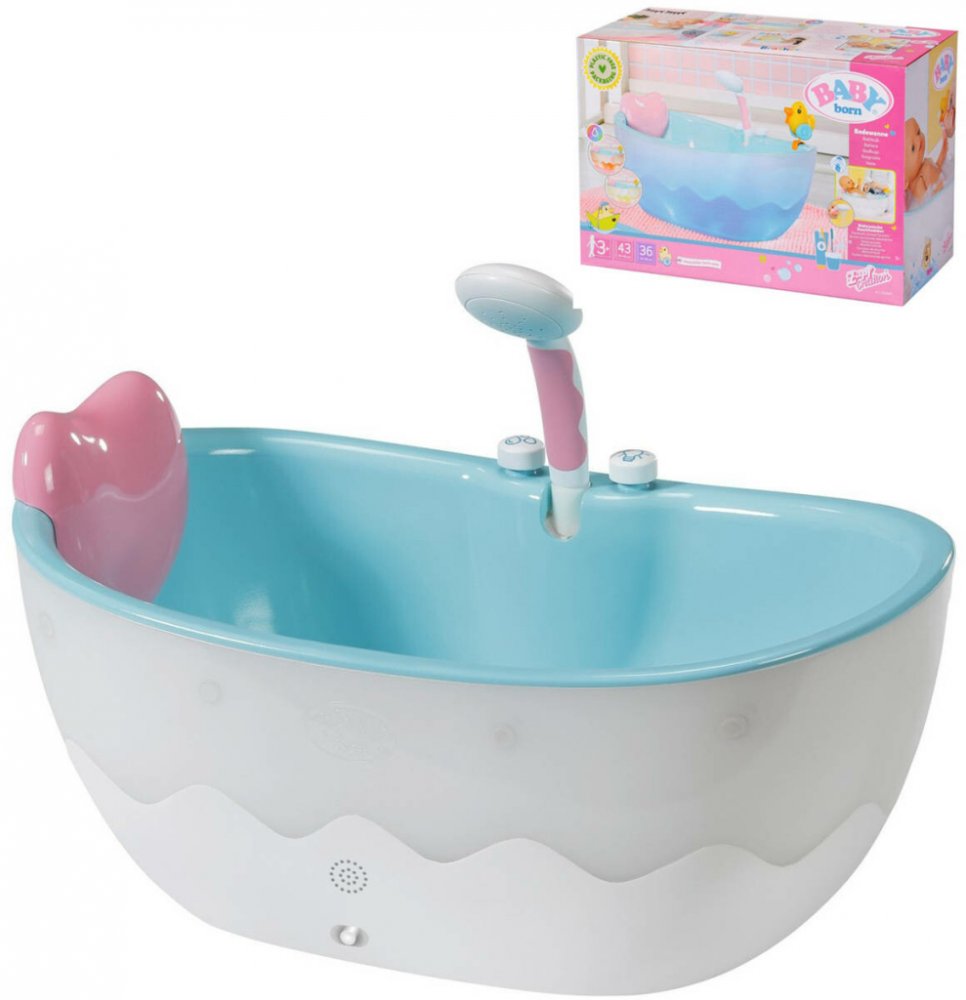 Zamířit, vystřelit… trefa! Starší bratříček je teď pěkně mokrý. S takovou kačenkou se dá ve vodě skvěle bojovat. Můžeš ji umístit na různá místa po okraji vany. Stejně tak i růžový polštářek. Vana je zevnitř modrá jako voda a zvenčí bílá s vyznačenou vlnkou. Když stiskneš tlačítko vedle sprchy, vnější plášť vany se rozsvítí v různých barvách. Sprchové tlačítko aktivuje bílo-růžovou sprchovou hlavici. Pokud je vana prázdná, uslyšíš šplouchání a typické zvuky vody. Pokud byla vana předem naplněna vodou, teče ze sprchové hlavice voda. Sprchovou hlavici lze naklonit směrem do vany, aby se neztratila ani kapka vody. Hadici je možné vytáhnout, aby se panenka BABY born mohla důkladně osprchovat. • Kvalitní příslušenství pro originální panenku BABY born. • Pro radost z nápadité, rozmanité a dlouhotrvající hry. • Vhodné pro panenku velikosti 36 cm a 43 cm. • Funguje na baterie (nejsou součástí). BABY born Vana se světelnými a zvukovými efekty. Součástí je polštářek a stříkací kačenka. Na baterie: 4x AA (nejsou součástí balení)
