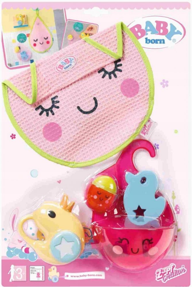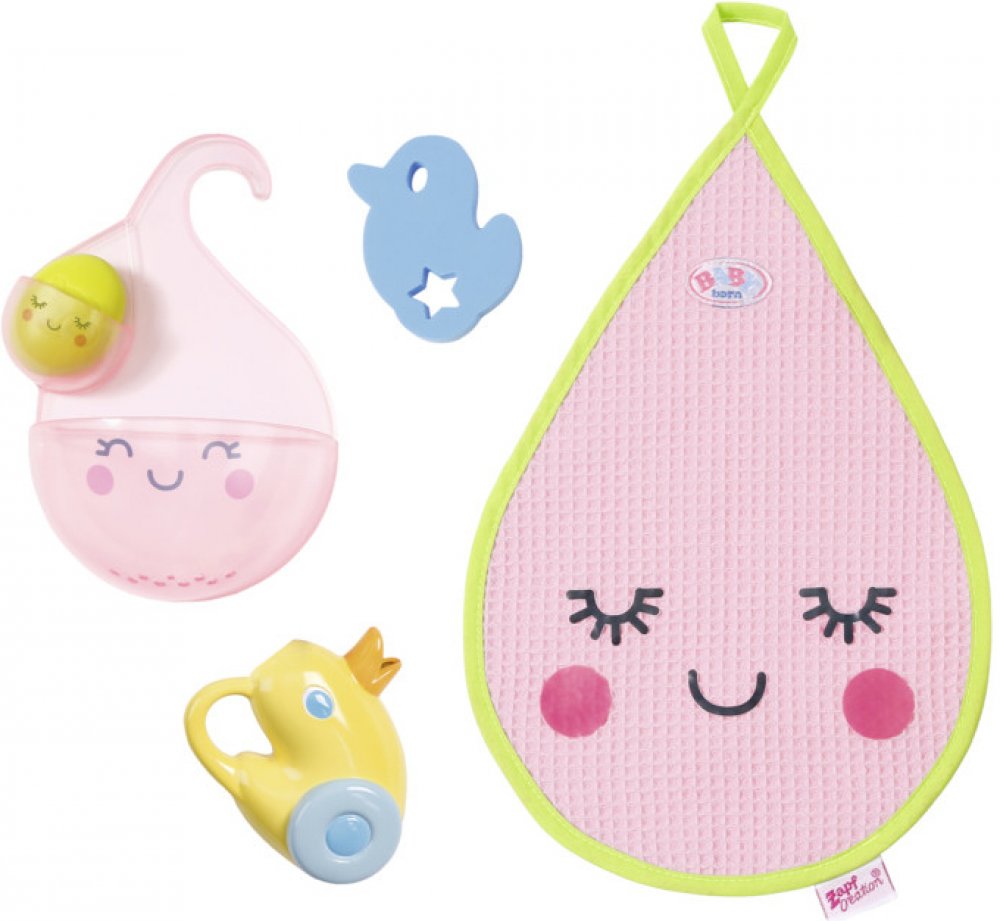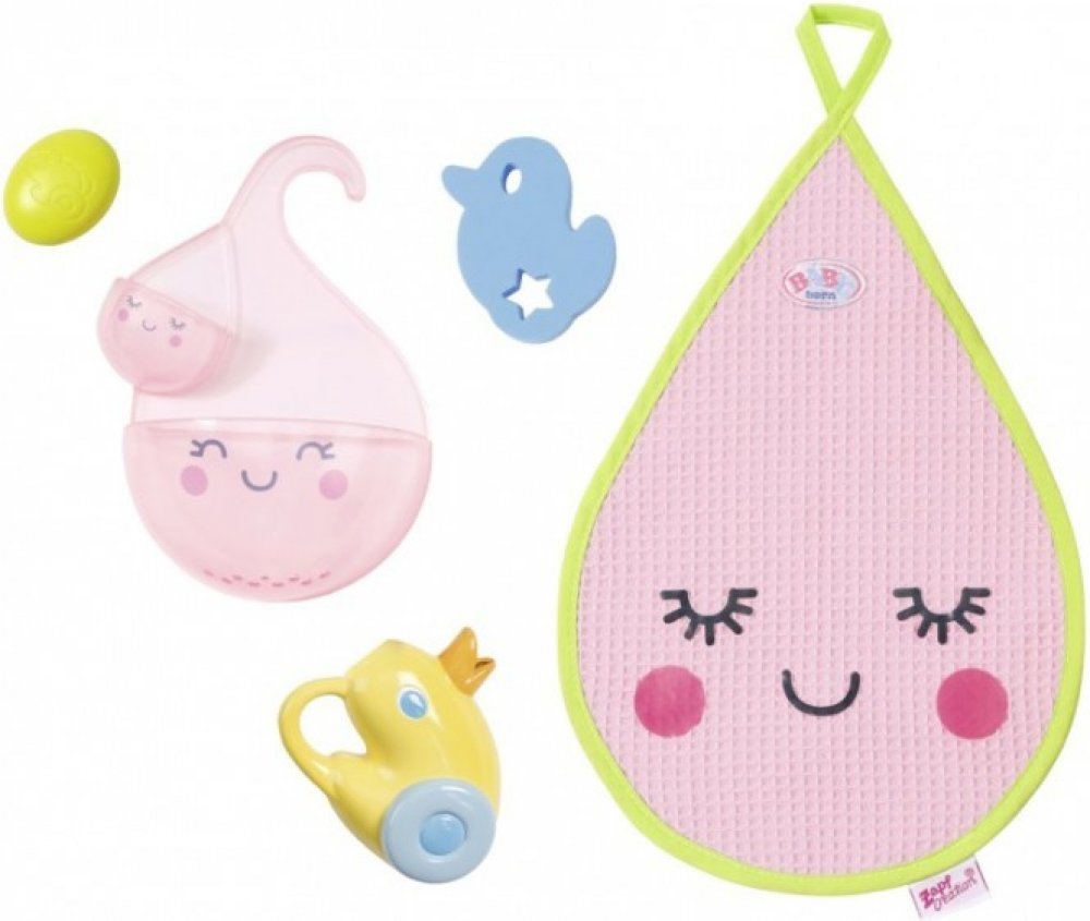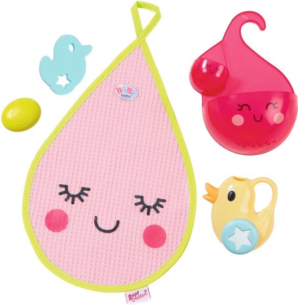 Cáky-cák koupání je taková legrace. Zejména se sadou koupelnových doplňků pro BABY born. Součástí je konvička ve tvaru kačenky Berty houbička ve tvaru kačenky limetkově zelené mýdlo ručník ve tvaru kapky a držák na mýdlomalá nádržka na vodu s velkou nádržkou na vodu. Zkus si vytvořit vlastní vodopád Nejprve naplň vodou konvičku pak vodu přelej do horního zásobníku pak ji postupně přelej do spodního zásobníku a nakonec do vany. A po hraní vše pěkně usuš ručníkem ve tvaru kapičky. Originální doplněk pro panenky BABY born. Pečlivě navržené doplňky rozvíjejí dětskou představivost a otevírají nové možnosti a témata hry. BABY born Doplňky do koupelny se zásobníky na vodu konvičkou houbičkou mýdlem a ručníkem.