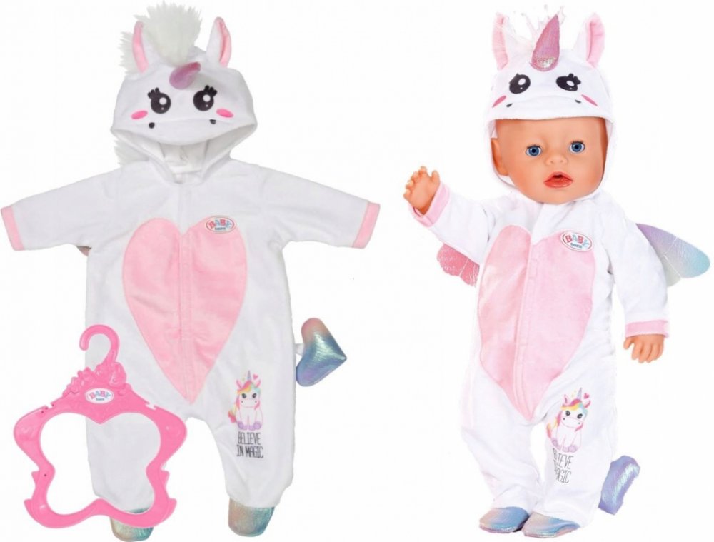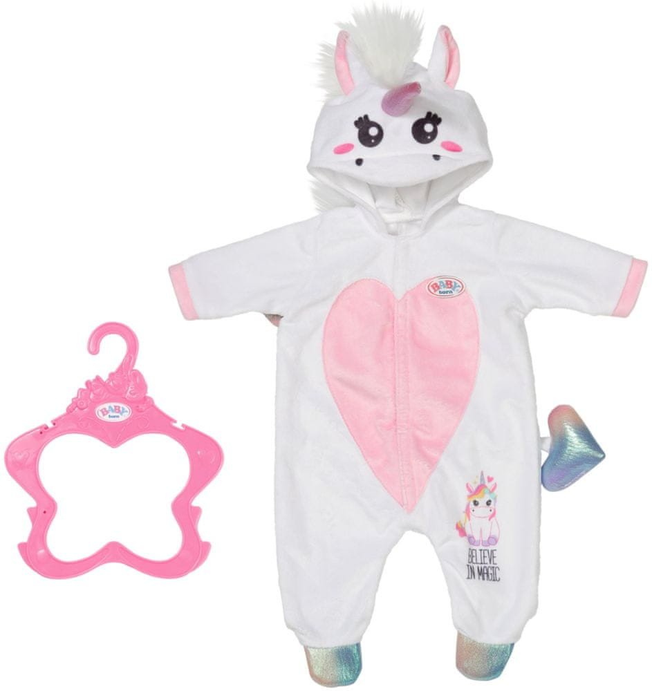 Originální doplněk pro panenky BABY born Pohádkový kostým tvoří bílý overal s barevnými detaily Kapuci zdobí třpytivý roh s roztomilými oušky Součástí je praktické šatní ramínko Kostým jednorožce je určen panenkám BABY born velikosti 43 cm Doplňky rozvíjí dětskou představivost a fantazii Hračka je vhodná pro děti od 3 let Obsah balení: 1× kostým 1× ramínko