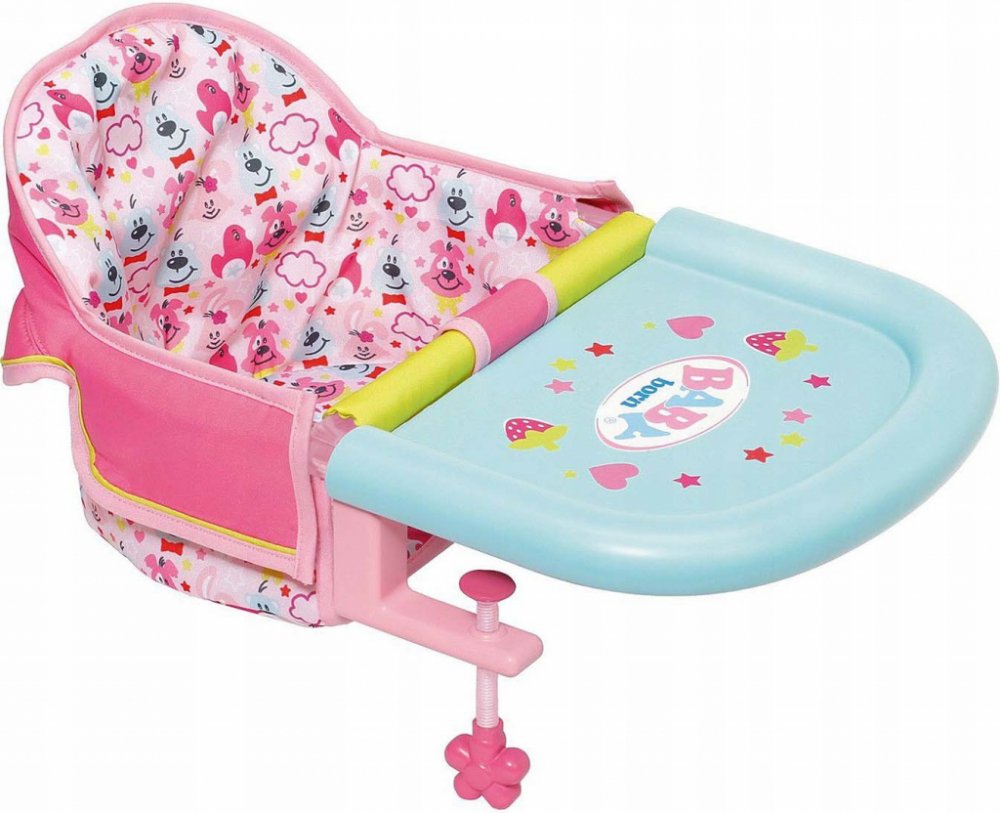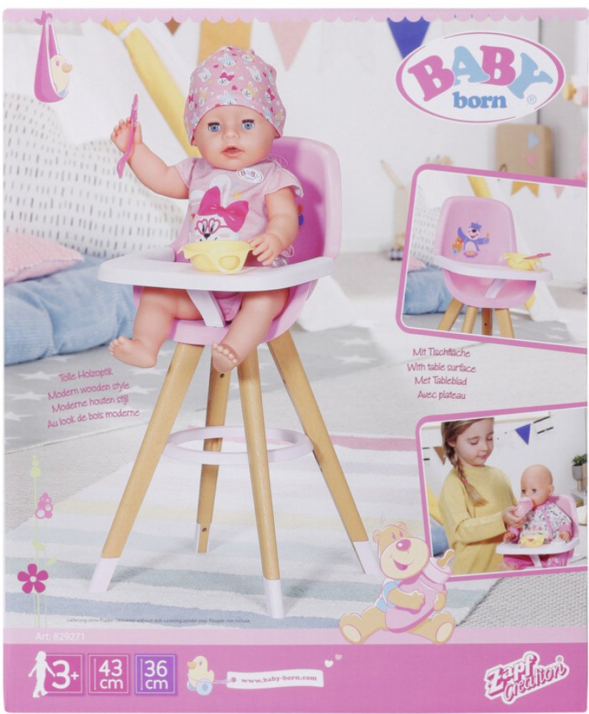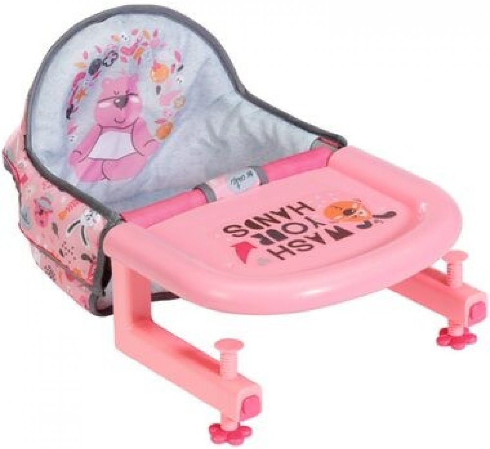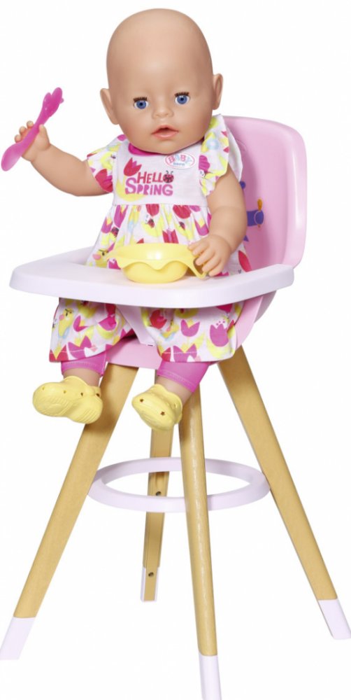 V praktické jídelní židličce je krmení BABY born hračka. Židlička ve skandinávském designu má nohy ve vzhledu dřeva a pohodlnou růžovou sedačku. Na opěrce čekají na oběd medvídek Bruno a kačenka Berta.