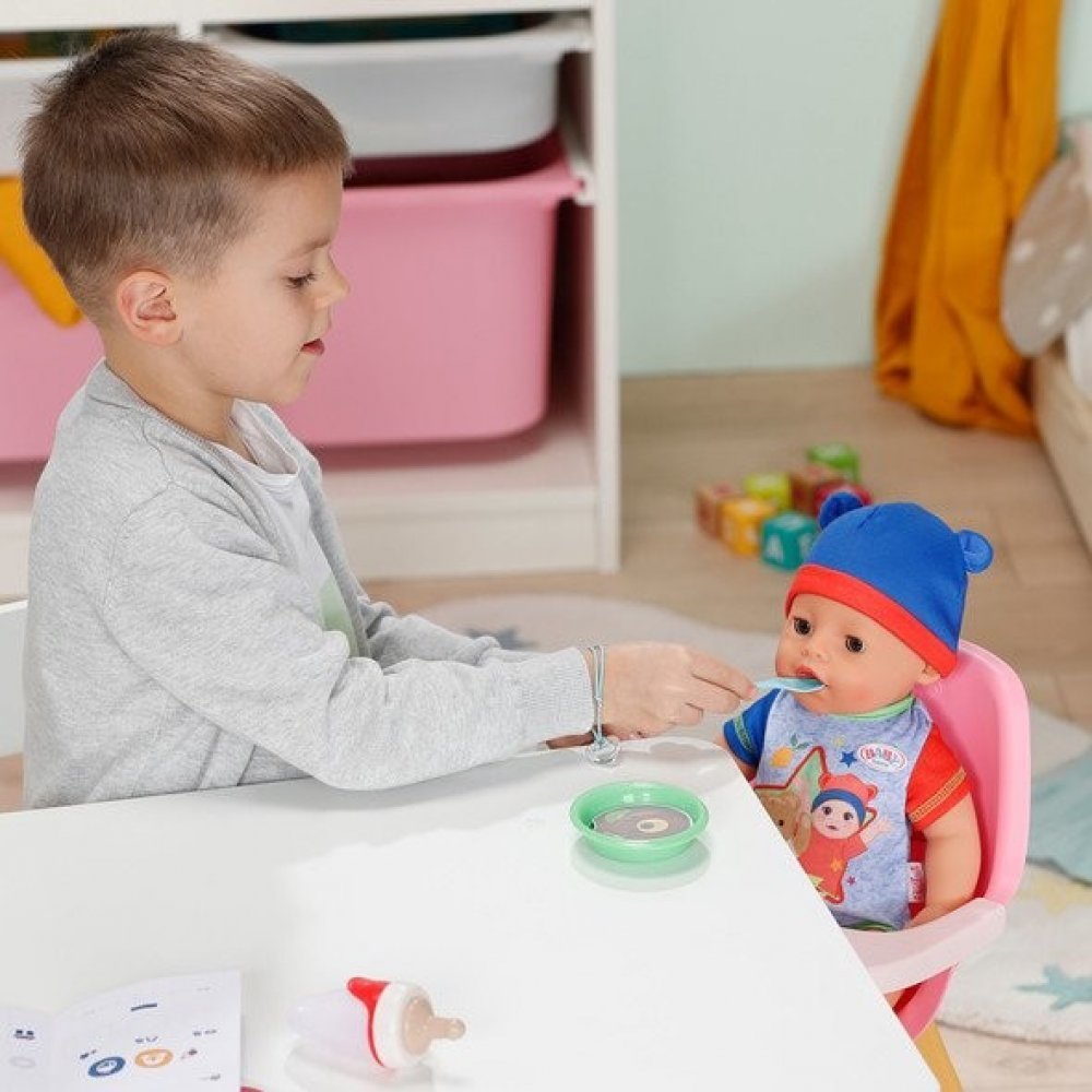 Přináší si s sebou i kouzelný talířek: když do talířku s bílou destičkou uvnitř dáte trochu vody, objeví se na destičce lahodné jídlo s roztomilým obličejem, které z krmení panenky udělá ještě větší zábavu.