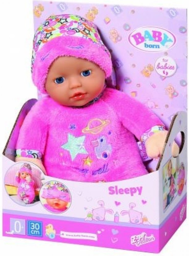 BABY born Sleepy pro děti 30cm Sweet Sleepy je opravdový ospalec. Vždy má na hlavě noční čepičku. Když je 30cm panenka s měkkým látkovým tělíčkem unavená, stačí jí přes obličej přetáhnout pokrývku hlavy s výšivkou oko na oko. 'Dobře se vyspi! Dobře se vyspi! Motto snílka je vyšité na plyšovém růžovém overalu spolu s nebeskými motivy. Panenka o velikosti 30 cm s lehkou vinylovou hlavou je vhodná pr...