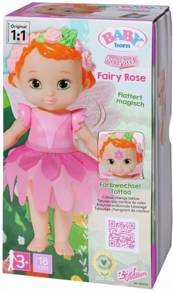 BABY born Storybook Růžičková víla je panenka velikosti 18 cm. Součástí je kouzelná hůlka, pódium, kulisy a obrázková knížka.