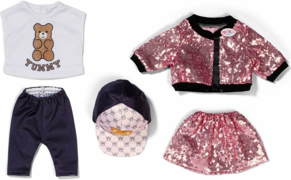 Baby Born třpytivé oblečení s růžovou sukní a bundou z flitrů, tričkem s potiskem medvídka, čepicí a legínami pro panenky velikosti 43 cm.