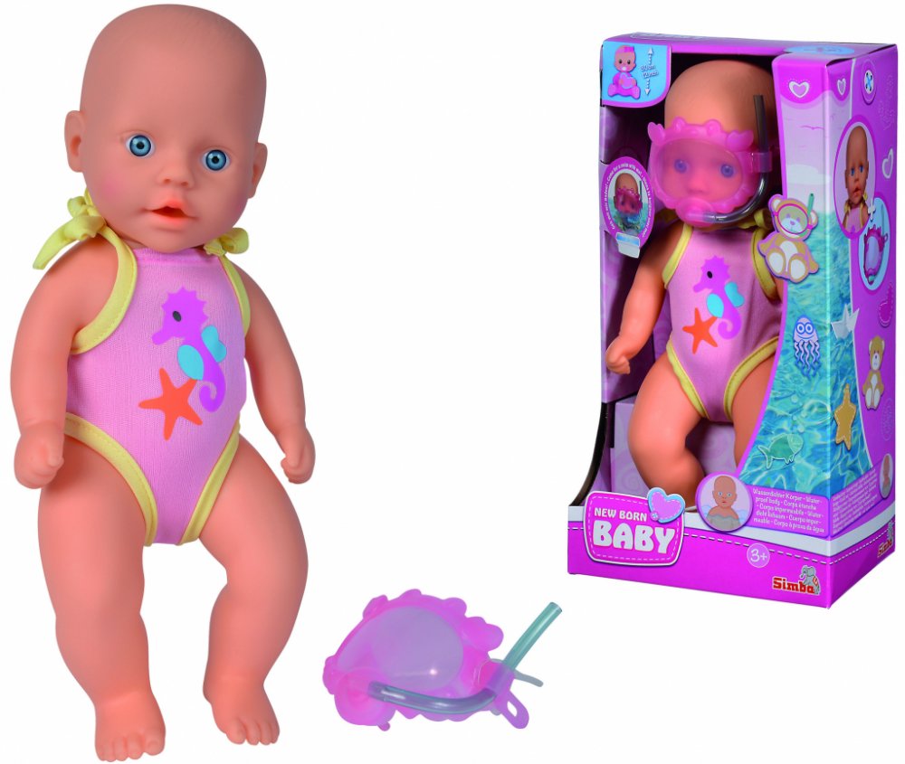 Dětská panenka s plaveckým úborem - koupací - od 3 letS koupací panenkou New Born Baby se mohou malé maminky panenek cákat a chodit plavat. Panenka má na sobě roztomilý plavecký obleček s roztomilým potiskem mořského koníka a hvězdice, který lze svázat na ramenou a také sundat. Potápění není problém s růžovými plaveckými brýlemi a šnorchlem. Panenka dělá skvělé bubliny. Koupací panenka New Born Ba...