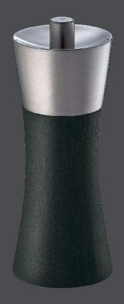 Dřevěný mlýnek na pepř AUGSBURG černé barvy s kombinací nerezové oceli, výšky 14 cm.