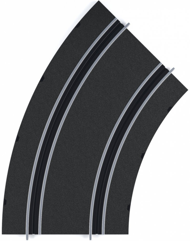 Samostatný díl dráhy, velká zatáčka, radius 470 mm, úhel 45°, rozteč drážek 90 mm, jemně drsný povrch.Z osmi velkých zatáček vznikne kruh o průměru 940 mm.