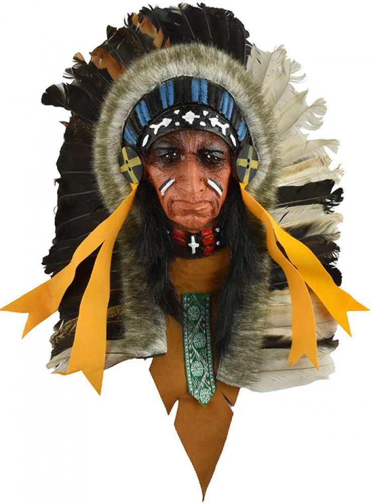 Indiánští náčelníci byli vůdci a moudří rádci svých kmenů, kteří nesli odpovědnost za rozhodování, ochranu a blaho komunity. Jejich autorita vycházela z osobní ctnosti, zkušeností a schopnosti vést, spíše než z dědičného práva. Často byli vnímáni jako strážci tradic, duchovní vůdci a zprostředkovatelé mezi lidmi a přírodou. Náčelníci byli respektováni pro svou statečnost, spravedlnost a schopnost vyjednávat s ostatními kmeny nebo kolonizátory, a jejich role byla klíčová pro udržení harmonie a rovnováhy v kmeni.S dekorací je dodáván háček pro zavěšení na zeď.