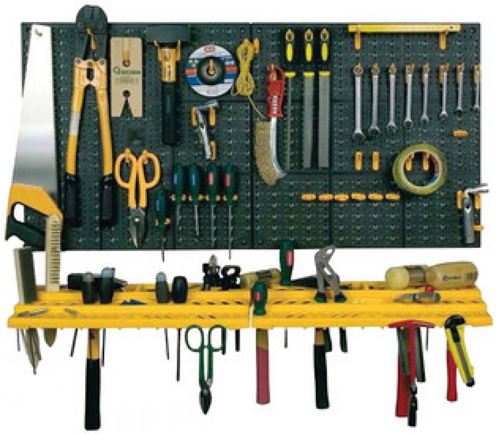 Stěna na nářadí TIPA O368\n \n 2× panel, 50 plastových úchytů, 2× zásuvný držák na nářadí. K upevnění na svislou podložku nebo zeď, bez upevňovacích šroubů, rozměry panel