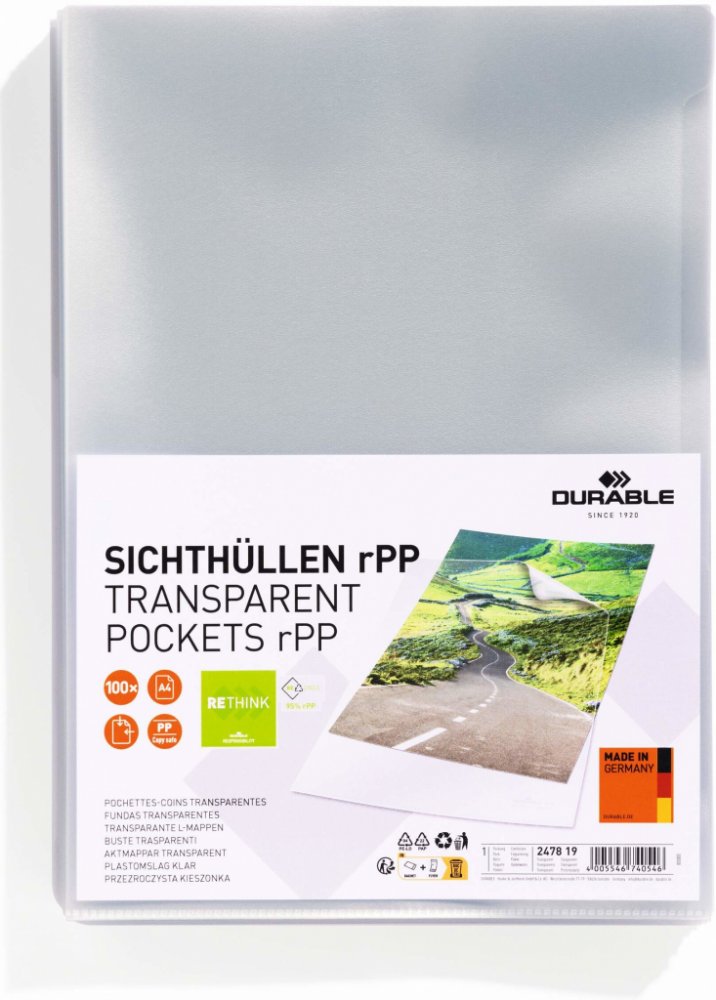 Závěsný obal A4 Durable Premium RECY - tvar L / 100 my / 100 ks
