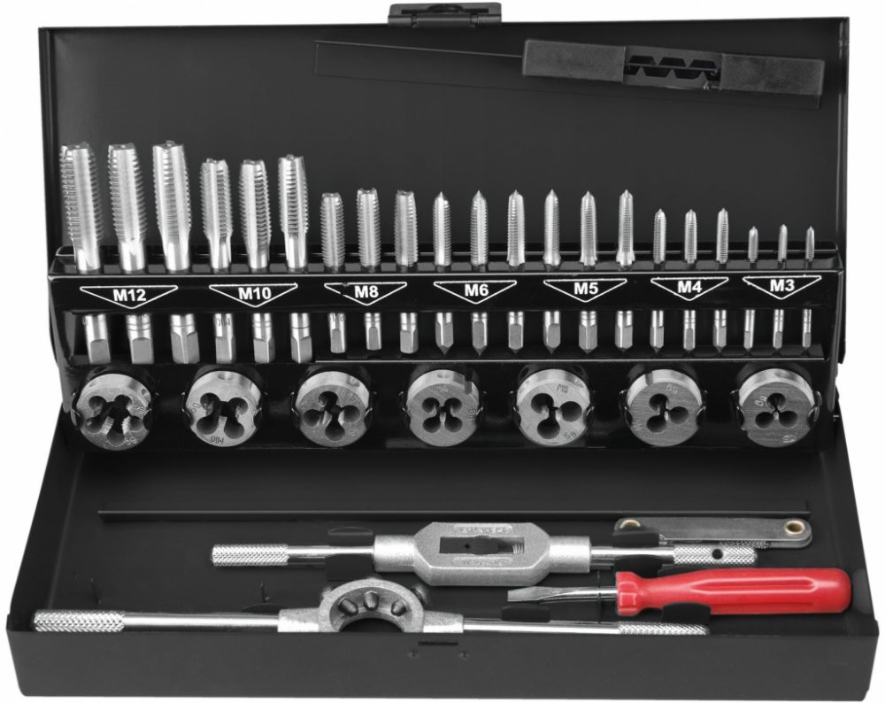 Závitníky i závitová očka z kvalitní nástrojové oceli splňují normy DIN 223, DIN 352, DIN 1814. Jsou vyrobeny z nástrojové oceli vysoké kvality a určeny k řezání vnitřních i vnějších závitů velikostí M3-M12. Nejprodávanější složení sady na trhu, pro velikosti závitů M3-M12. Baleno v kovové kazetě pro snadnou manipulaci a transport.