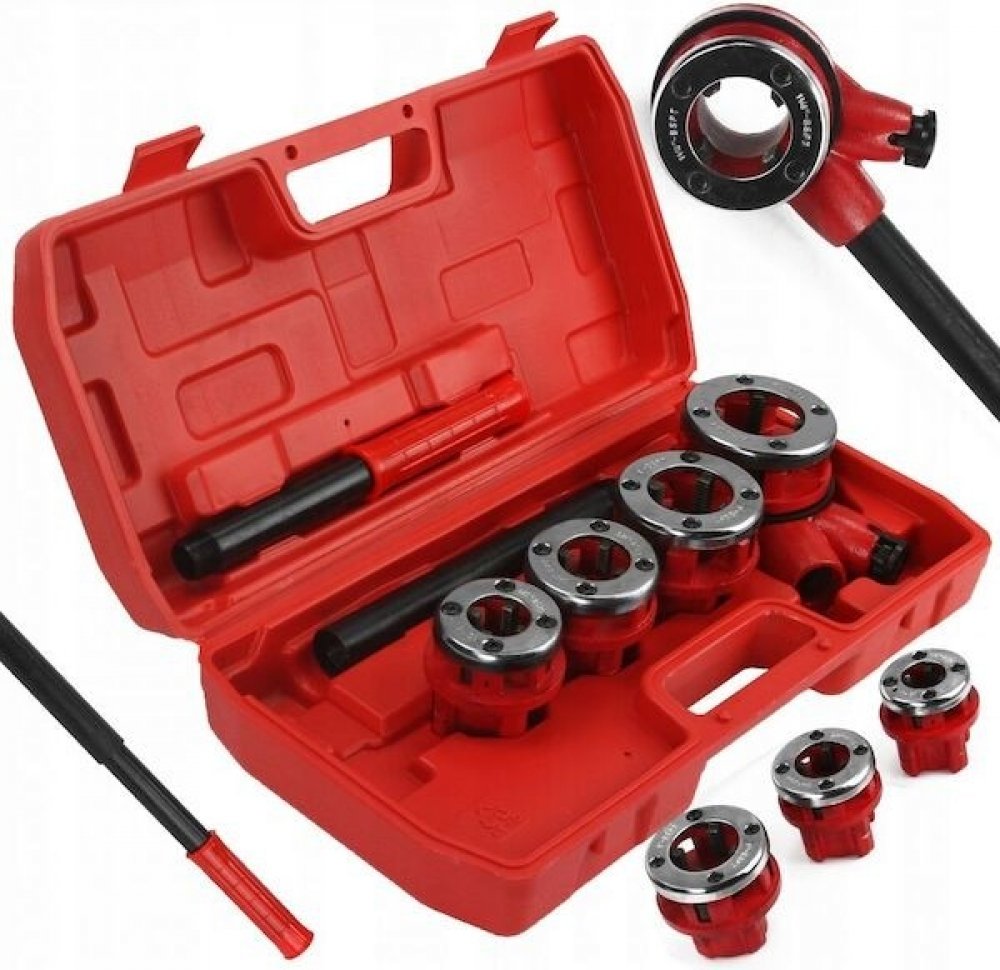 Sada obsahuje 4 litinové závitníky s 4 noži z nástrojové oceli, račnovou hlavu a dvojdílnou rukojeť.