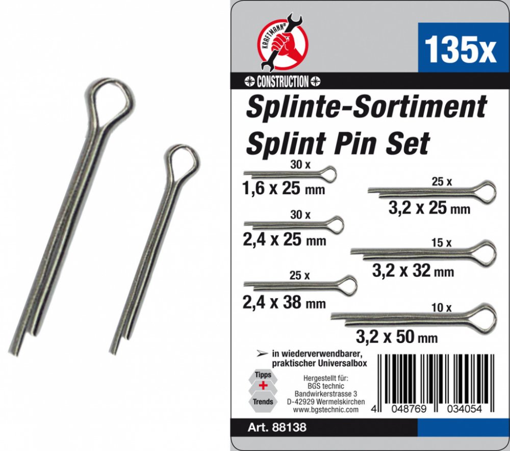 Závlačky 1,6-2,4-3,2 mm, různé délky, sortiment 135 dílů - BGS 88138