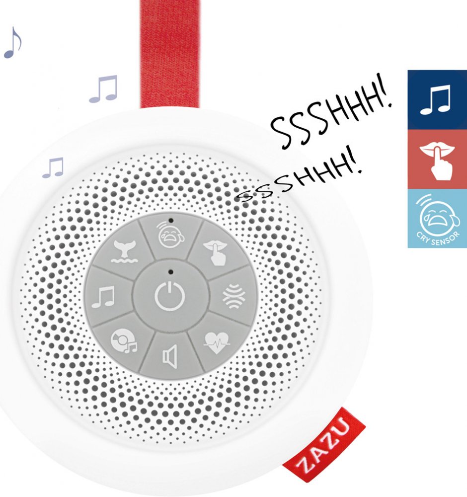 - Přehrává 6 melodií: Ššš...Ššš..., zvuk tlukotu srdce, bílý šum, zvuk oceánu, uklidňující hudbu a ukolébavky.