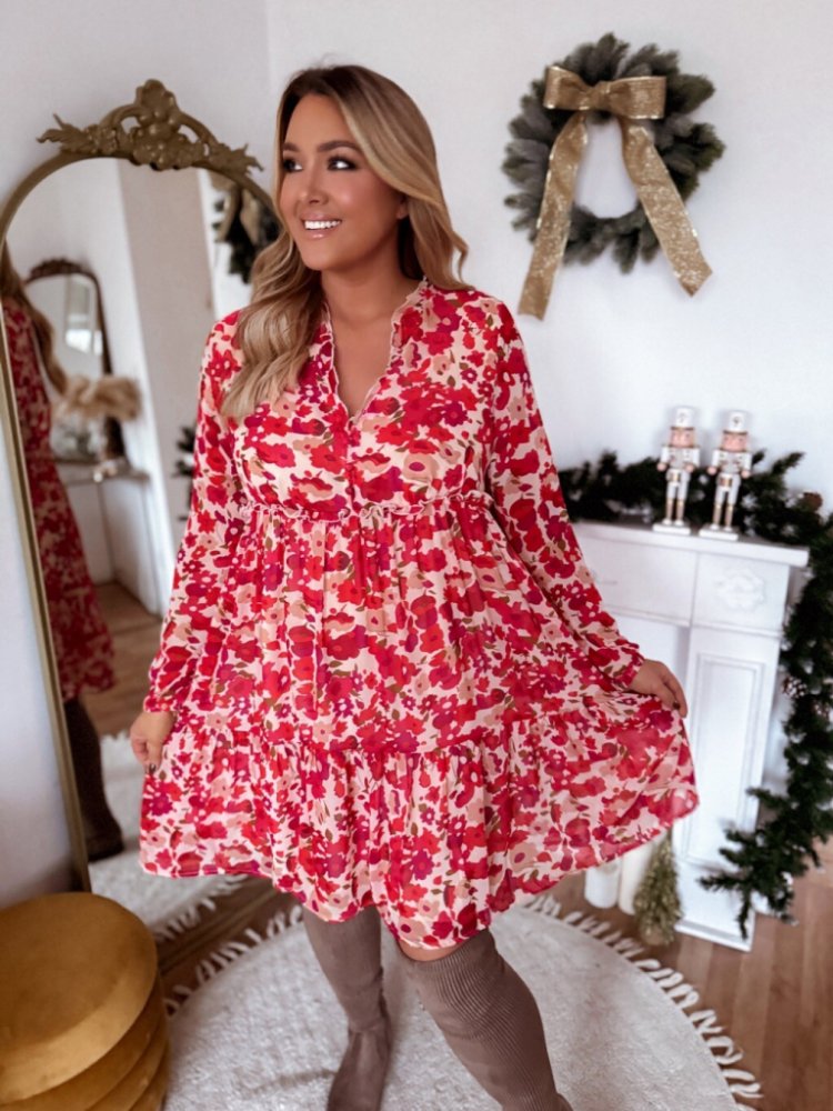 Krátké šaty s květy mají volný áčkový střih. Modelka měří 168 cm a má na sobě velikost L/XL.