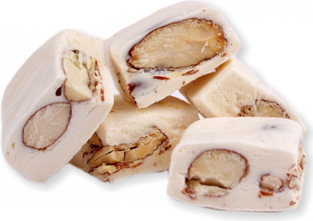 Složení: cukr, glukózový sirup, mandle 15%, plně hydrogenovaný palmojádrový tuk, sušený VAJEČNÝ bílek, přírodní medové aroma.
