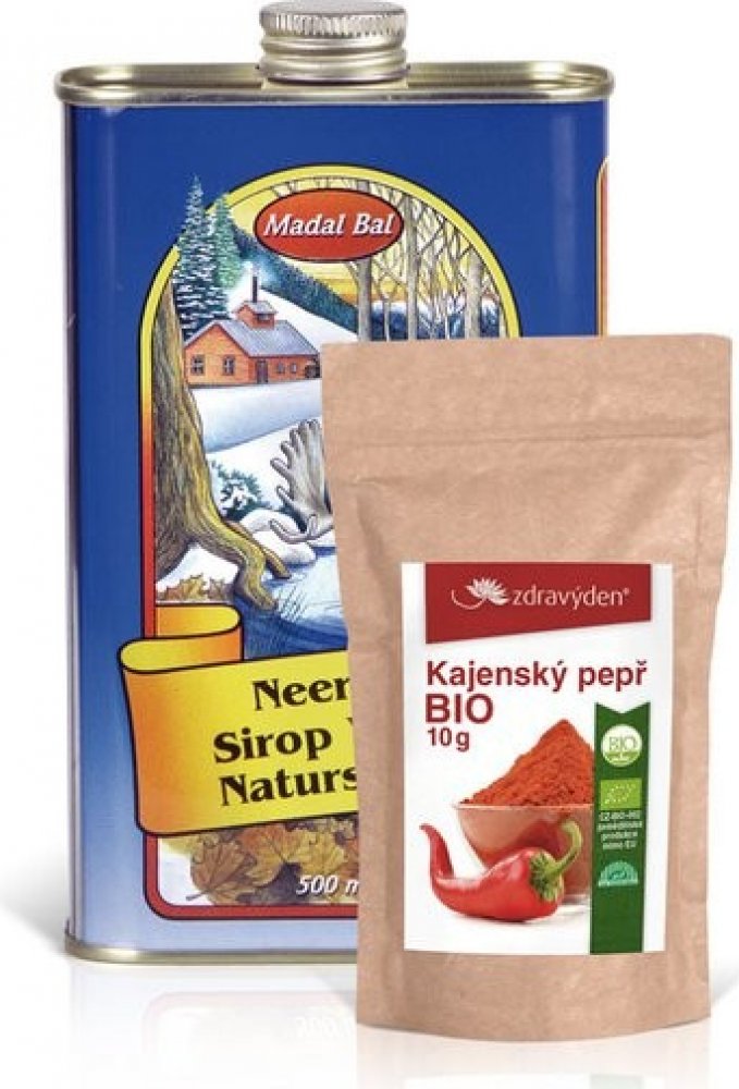 Neera na třídenní kúru: 0,5l Neera přírodní stromový sirup, Kajenský pepř BIO 10g a leták s podrobným popisem kúry.