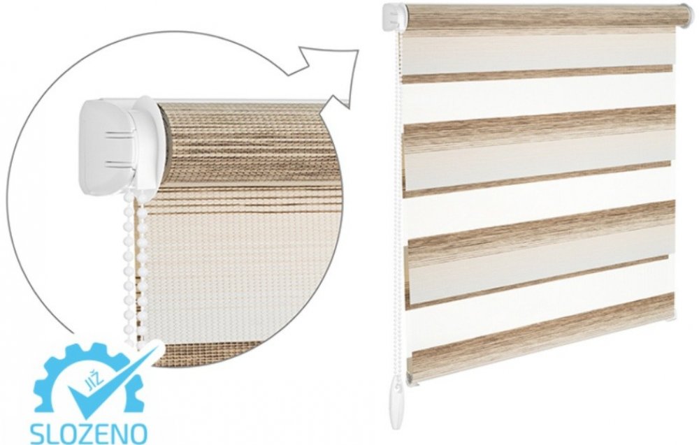 Rolety DEN A NOC jsou ideálním a moderním způsobem jak plynule regulovat stínění ve dne a zabezpečit pocit soukromí v noci. Princip je založen na dvou vrstvách látky, kde se střídají průhledné a neprůhledné vodorovné pruhy. Navíjením jedné vrstvy látky dochází k regulaci průniku světla. Řetízkovým ovládáním si tedy můžete navolit pruhy látky tak, aby jste v místnosti vytvořili světlo nebo tmu - je to jenom na Vás. Roletu můžete zastavit v libovolné výšce.