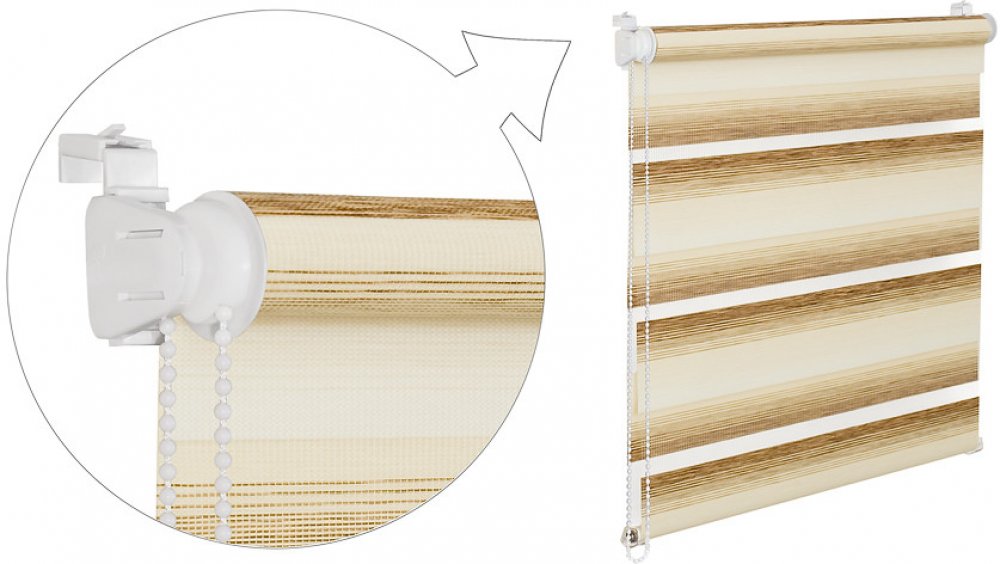 Rolety DEN A NOC jsou ideálním a moderním způsobem jak plynule regulovat stínění ve dne a zabezpečit pocit soukromí v noci. Princip je založen na dvou vrstvách látky, kde se střídají průhledné a neprůhledné vodorovné pruhy. Navíjením jedné vrstvy látky dochází k regulaci průniku světla. Řetízkovým ovládáním si tedy můžete navolit pruhy látky tak, aby jste v místnosti vytvořili světlo nebo tmu - je to jenom na Vás. Roletu můžete zastavit v libovolné výšce.