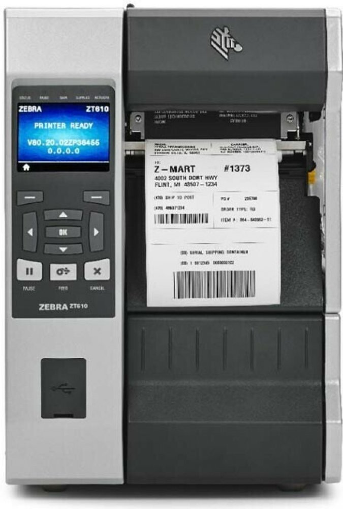label printer, industrial printer, thermal transfer, 8 dots/mm (203 dpi), media width (max.): 114 mm, print width (max.): 104 mm, roll diameter (max.): 203 mm, speed (max.): 356 mm/s, display (touch screen, colour), real time clock, USB, RS232, Bluetooth (Class 5.3), Ethernet (10/100/1000 Mbit), Wi-Fi (802.11ax), RAM: 1 GB, Flash: 2 GB, emulation: ZPL, ZPLII, XML, incl.: power cable (EU, UK), order separately: interface cable