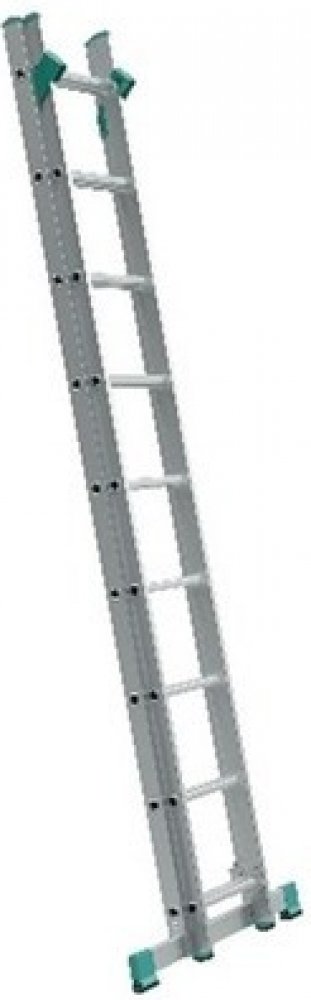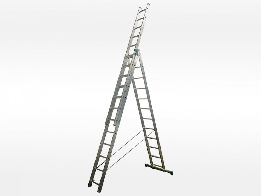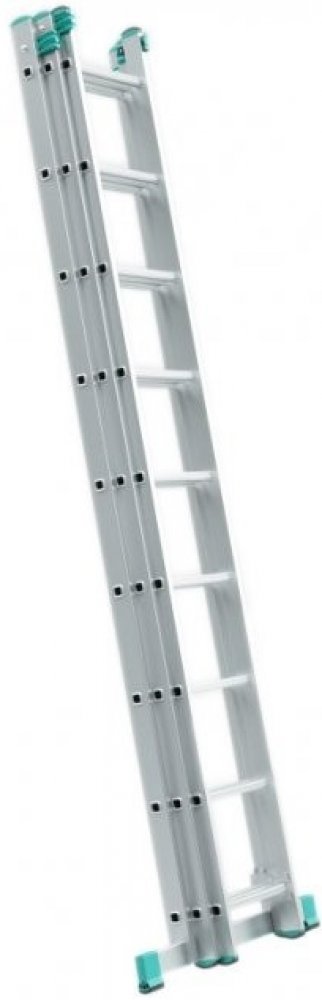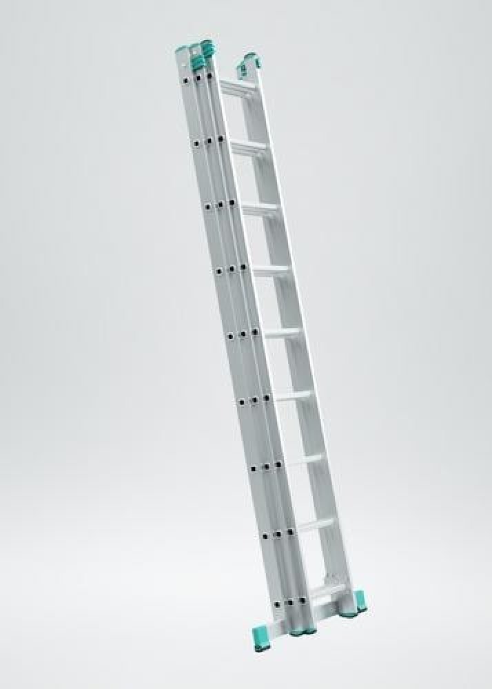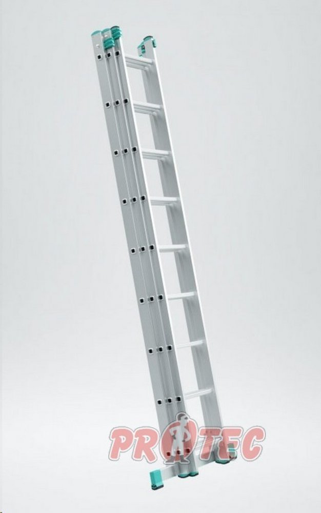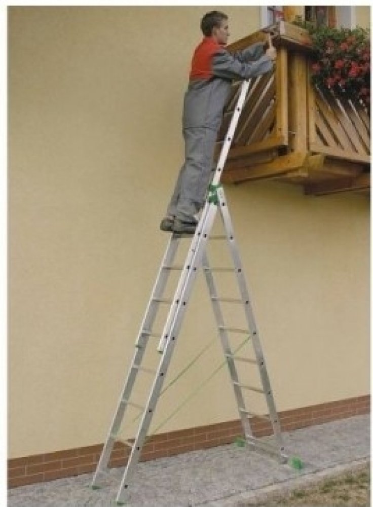 Žebřík Al un. 3d.12 příček 7,96m 7612 EUROSTYL Třídílný žebřík typu EUROSTYL vyrobený z hliníku. Disponuje stabilizační tyčí pro lepší stabilitu a je zaopatřen jistícími pásy. Žebřík se dá využít pro všechny druhy prací kolem rodinného domku, chaty nebo i lze najít využití vy firmách. Lze ho nastavit téměr na dvounásobnou délku díky zahakovacímu mechanismu. Pokud budete potřebovat štafle můžete si je sestavit. Určeno pro exteriér. Plastové části a kovové uchycení má šedou bravu jinak má žebřík klasickou stříbrnou barvu. Počet stupínků: 3 x 12 Nosnost: 150 Kg Výrobek váží pouze: 22,4 Kg Rozměry podle obrázku: A = 342 cm B = 796 cm F = 115 cm G = 268 cm H = 752 cm h = 541 cm Z bezpečnostních důvodů je doporučeno žebřík nastavit max do 7,96 m kdy se překrývají alespoň 3 příčky