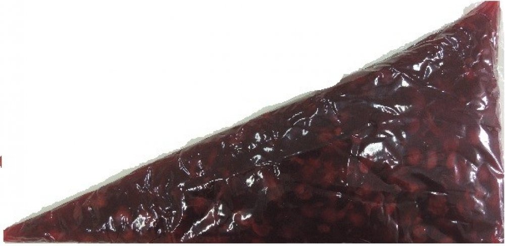 Višňová náplň s vysokým podílem ovoce (45%), lesklá, obsahuje viditelné kousky ovoce.