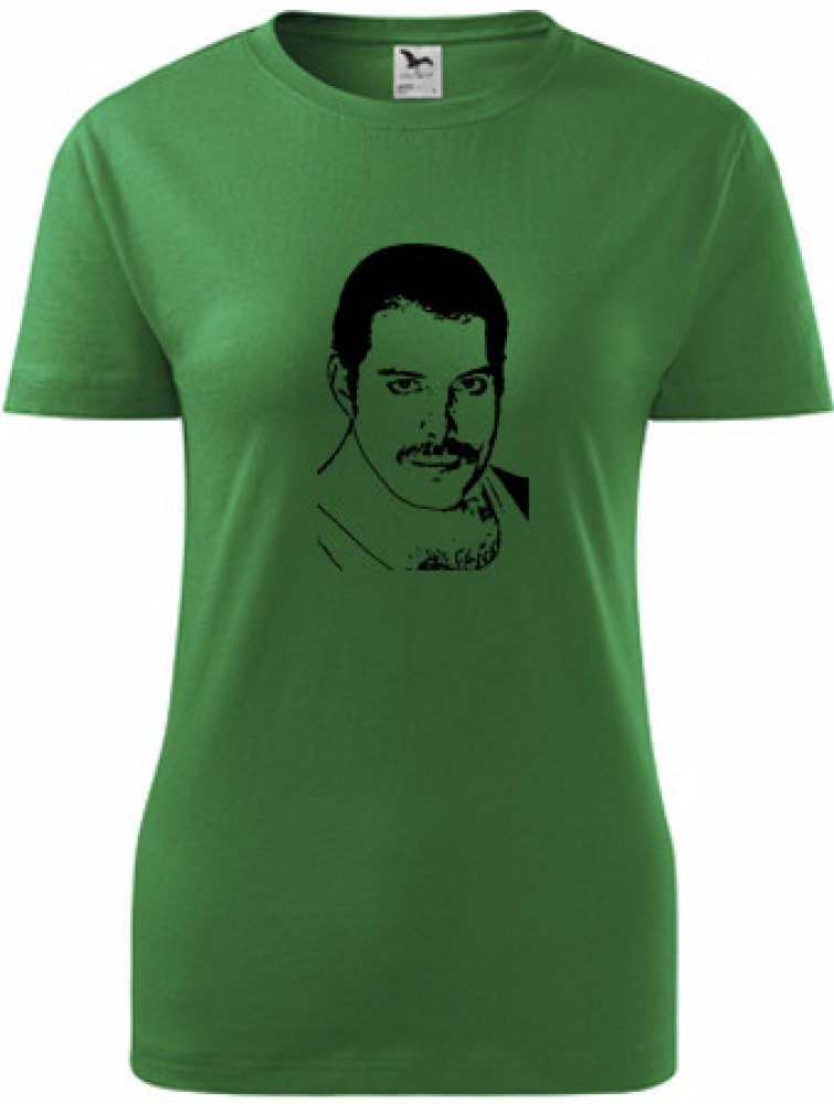 Zelené dámské tričko Freddie Mercury. nabízené velikosti jsou S,M,L,XL,XXL. Výběr z 12ti barev. Tričko patří do kategorií . Technologie potisku: Tisk na tričko je realizován pomocí termolisu a potisk je velice trvanlivý.