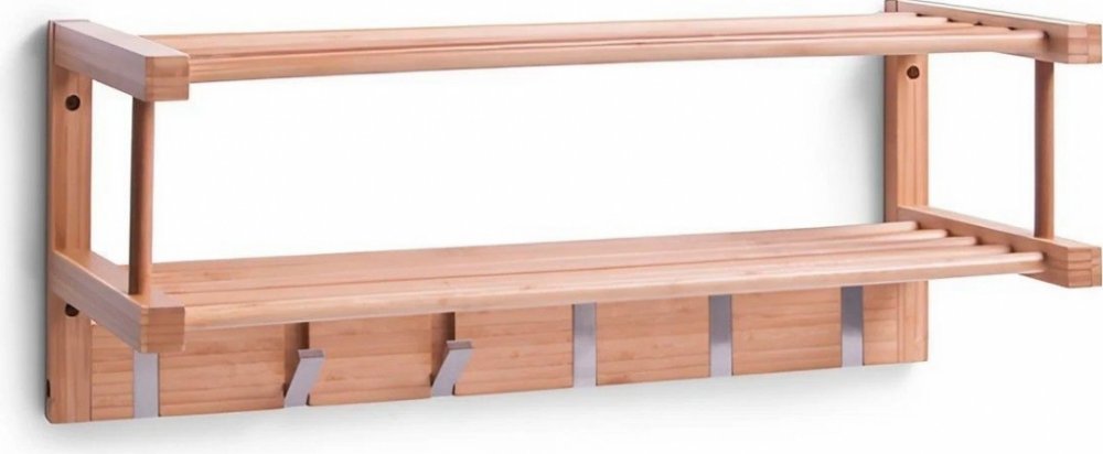Dvouúrovňová police na oblečení do předsíně nebo technické místnosti. Pomůže chytře zorganizovat prostor. Vhodná pro zavěšení bund, kabátů a pro uložení čepic, šál, rukavic atd. Vyrobena ze 100% přírodního bambusu, který je velmi odolný proti poškození. Vybavena 6 háčky z nerezového hliníku v saténové barvě. Nejvyšší kvalita, estetický design a pečlivé provedení.