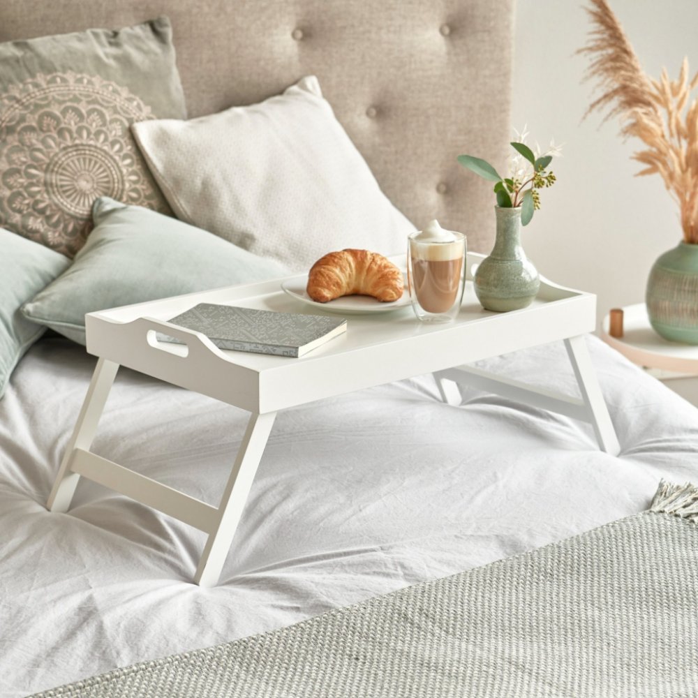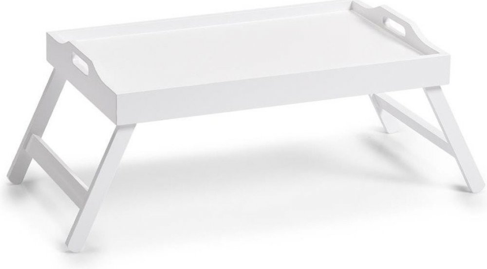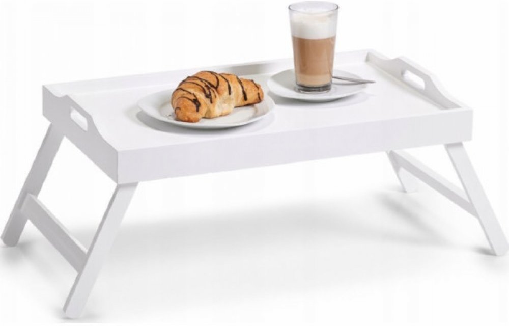 Pokud chcete překvapit svou druhou polovinu snídaní podávanou v posteli, vyberte skládací stůl Zeller. Představte si, že ráno jste probuzeni vůní míchaných vajec, toastů a čerstvě mleté kávy, otevřete oči a uvidíte příjemné překvapení od svého partnera. Kdo nemá sen o snídani do postele a začít den v dobré náladě? Skládací stůl Zeller je určitě každé ráno příjemné a zajistí pohodlné jídlo na posteli. Stůl je vyroben z pevného a odolného MDF v univerzální bílé barvě, která zajistí trvanlivost výrobku i po mnoho let. Skládací nohy zajistí, že při složení bude trvat velmi málo místa, což určitě zlepší skladování. Dvě boční rukojeti azvednuté hrany umožňují snadné a bezpečné přenášení i teplých jídel. Tento mimořádně praktický výrobek po skládání nohou je ideální pro servírování občerstvení a nápojů během večírku s přáteli nebo rodinnými setkáními.