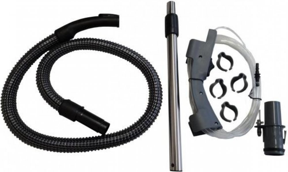 Sada obsahuje sadu na šamponování s rozprašovačem a příchytkami, trubici nerezovou určenou na sání přes vodu, a kompletní hadici s koncovkou a madlem pro uvedené vysavače.