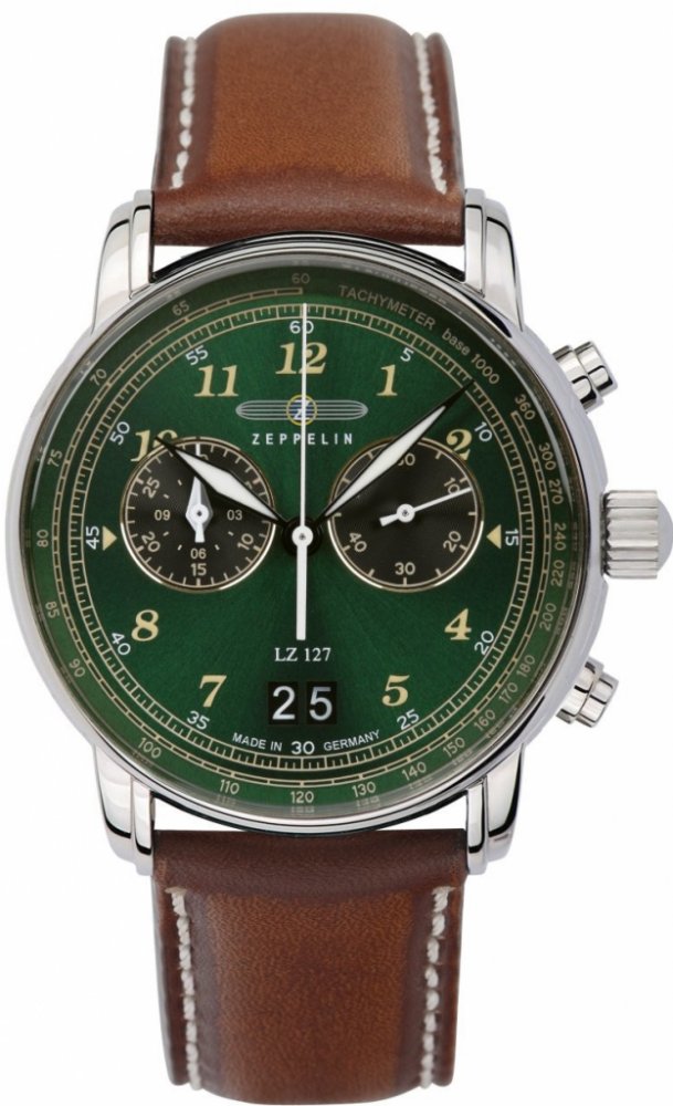 Zeppelin analogové kůže klasické pánské bateriové - quartz vhodné k plavání (50–100 m) 41.0 mm ocel 50 m bateriové 60 g minerální 21.5 cm LZ127 Graf Zeppelin kulaté hnědá zelená trnová spona 2 cm na ruku německé s arabskými číslicemi 4.1 cm střední pevná 20.0 mm 12.0 mm 41.0 mm s nenáročnou údržbou (quartz) bez chytrých funkcí