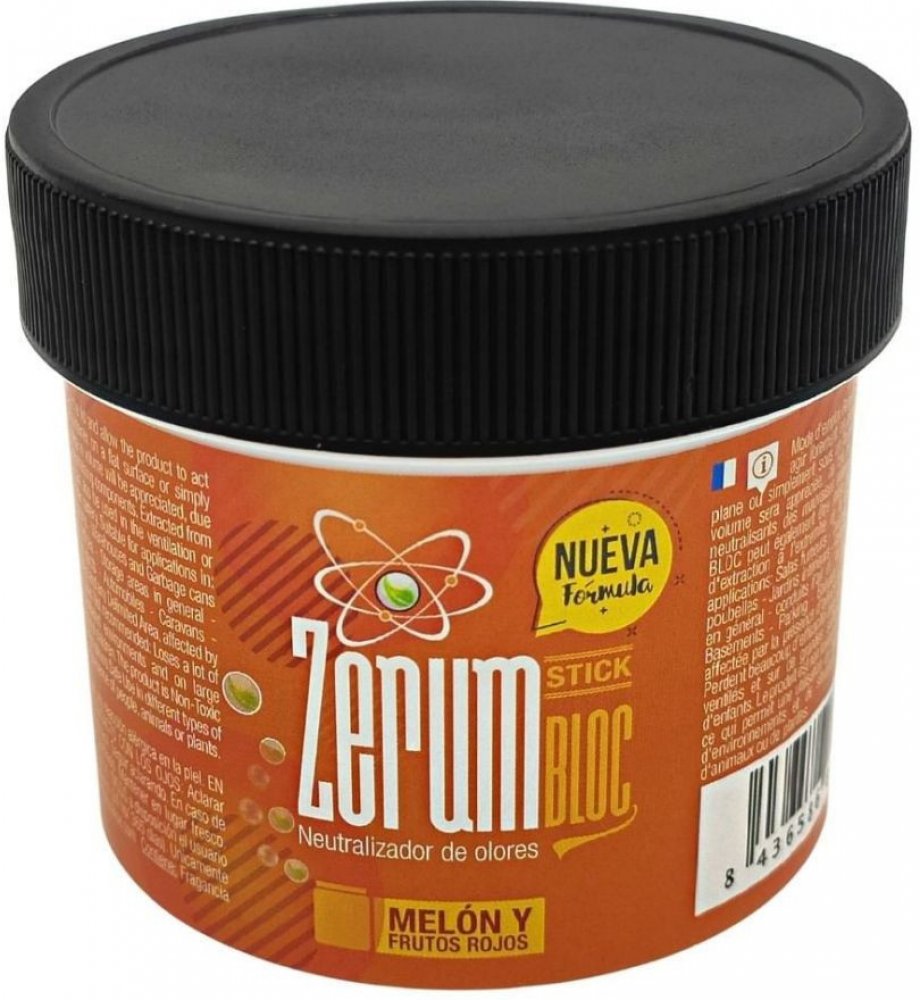 Univerzální, netoxický a účinný neutralizér zápachu Zerum BLOC Stick Meloun & Lesní plody, 170 g je pevný odstraňovač nepříjemných pachů. K dostání v balení 170 nebo 720 g a 4 vůních: lesní jahoda (Fresa silvestre), meloun a červené ovoce (Melón y frutos rojos), máta (Mentolado), neutrální (Neutro).