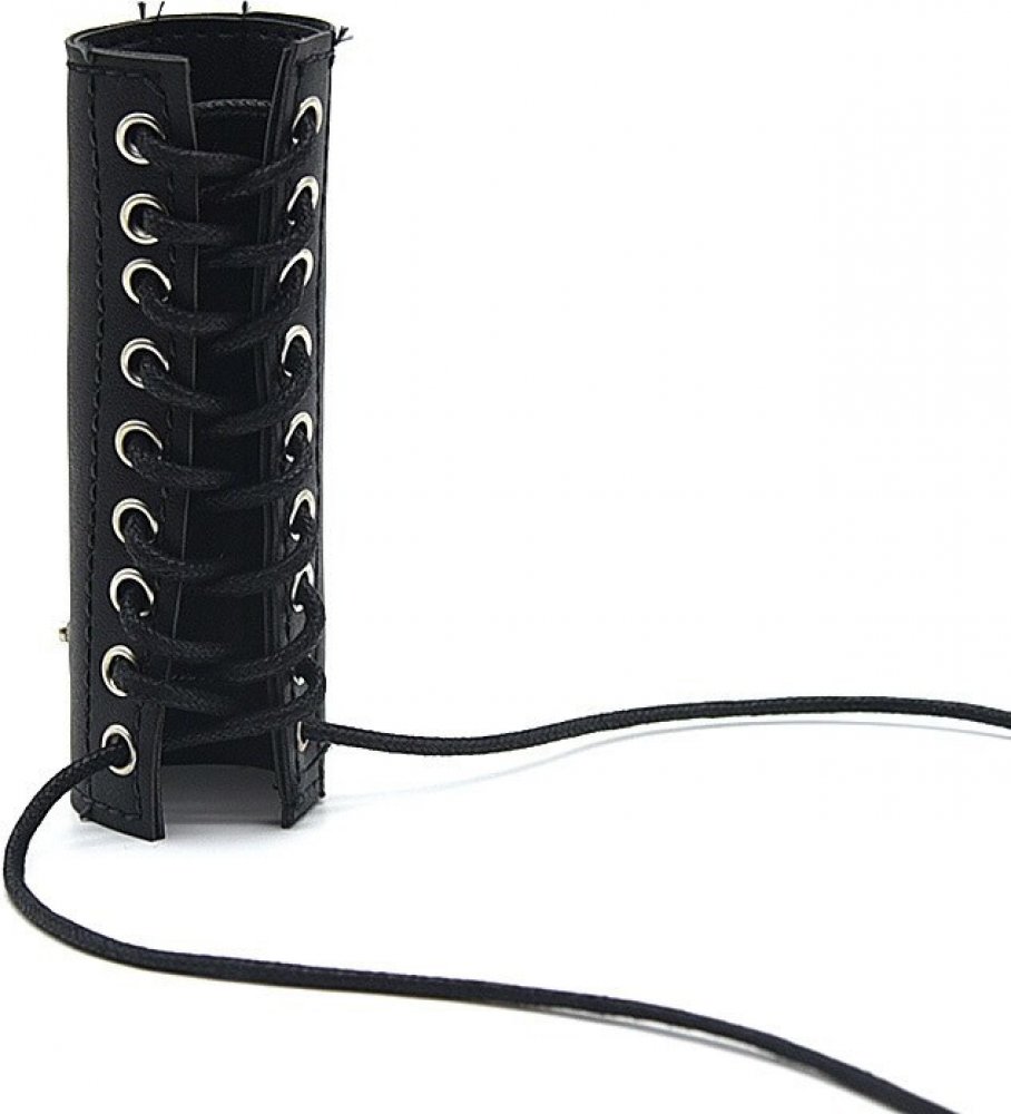 Koženkový postrojek návlek na penis k sadě Electro Sex Kit. Postrojek je z jedoho velkého plátu koženky upravovatelný šněrováním.