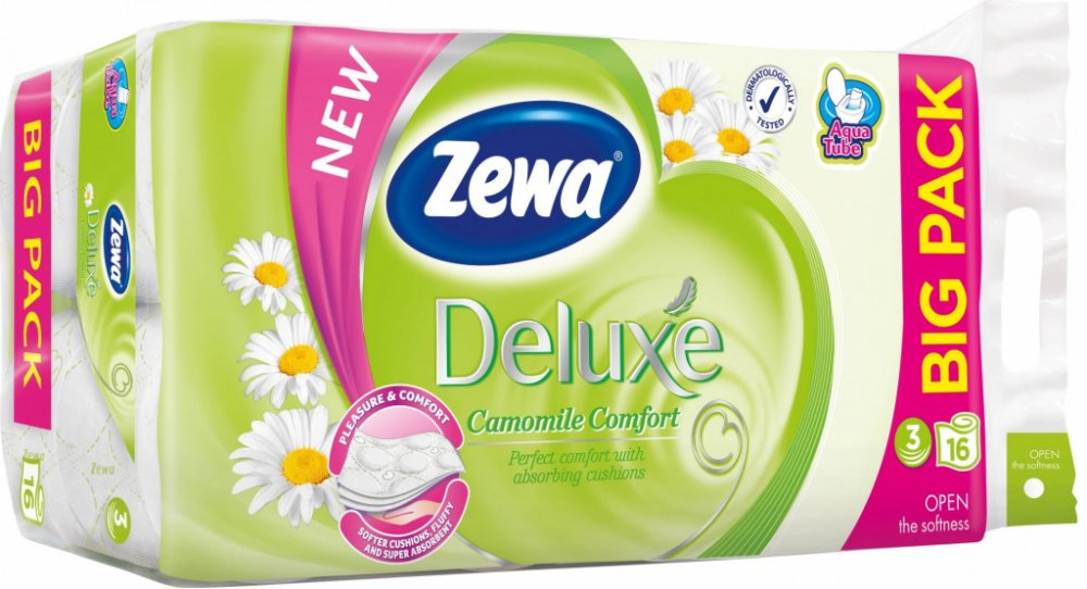 ZEWA Deluxe Camomile Comfort je bílý třívrstvý toaletní papír který je potištěn příjemným zeleným vzorem a voní po heřmánku I díky tomu se stal tak oblíbeným v našich domácnostech i kancelářích Tři vrstvy toaletního papíru poskytují extra jemnost a pevnost Roličky AquaTube z tohoto toaletního papíru ZEWA mohou být pohodlně vhozeny do toalety a spláchnuty kde se snadno rozpustí Řada Deluxe je navíc vyráběna z recyklovaného papíru