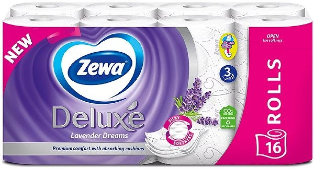Zewa Deluxe Lavender Dreams toaletní papír. Měkký, savý a odolný – ideální kombinace pro toaletní papír. 3vrstvý papír zaručuje příjemný pocit na pokožce a jemné a spolehlivé čištění. Silný toaletní papír má elegantní bílá barva a mírně reliéfní logo Zewa . Tento luxusní a zároveň moderní vzhled lze bez námahy zakomponovat do stylu interi...