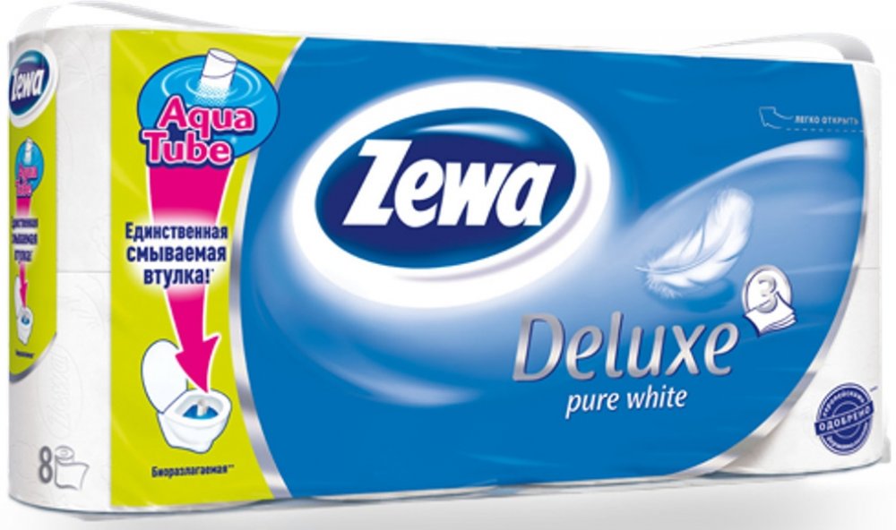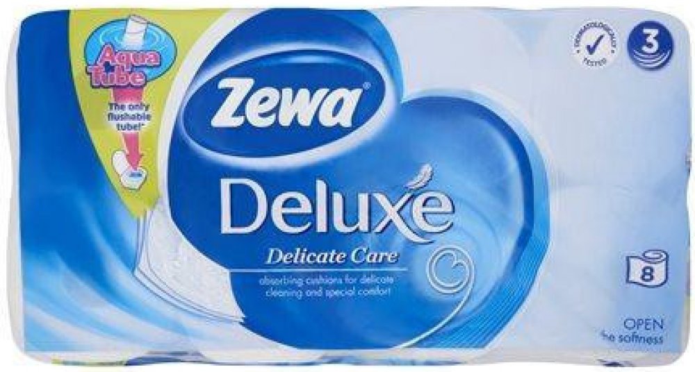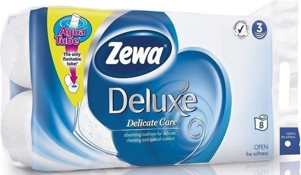 Zewa toaletní papír 8 ks Deluxe Delicate Care 3-vrstvý:Zewa Deluxe Delicate Care je kvalitní 3-vrstvý toaletní papír s unikátní roličkou Aqua Tube a je bez potisku. Jediná rolička, kterou můžete spláchnout do toalety! 1: Jednoduše vhoďte roličku do záchodové mísy a spláchněte. Není třeba ji splachovat samostatně. 2: Rolička se v potrubí okamžitě rozpustí a je biologicky rozložitelná, protože je vy...