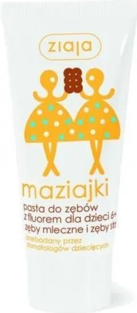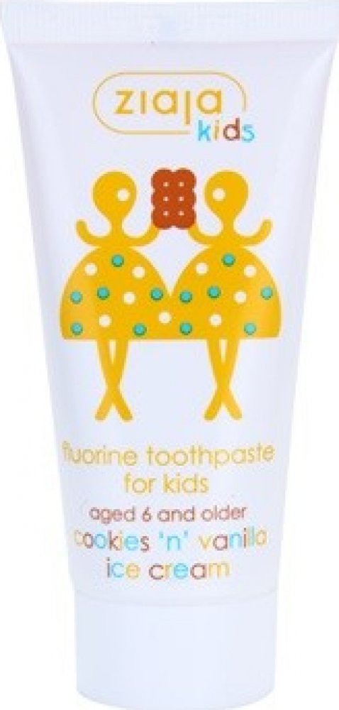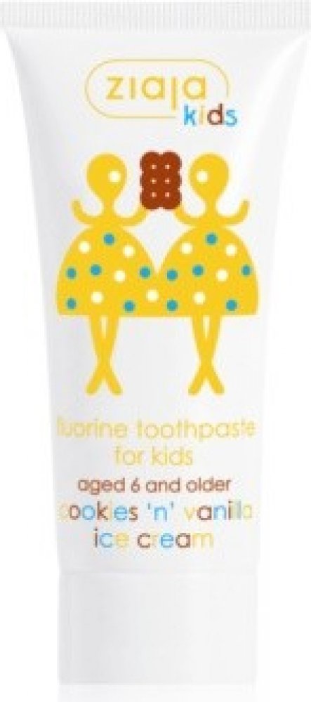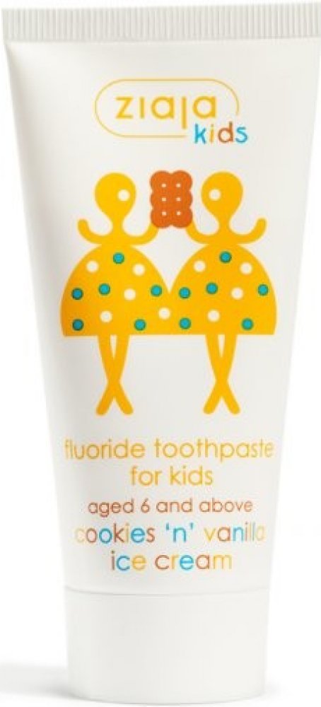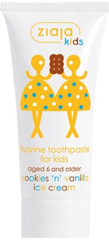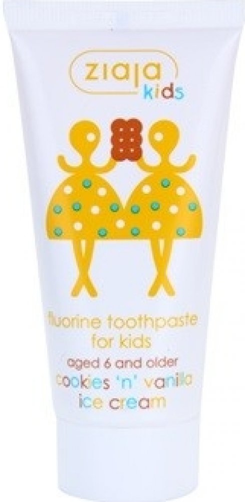 Dětská zubní pasta s fluorem s příchutí sušenek a vanilkové zmrzliny pro čištění mléčných zubů, prvních stoliček a nových trvalých zubů dětí od 6 let. Množství fluoru je přizpůsobené potřebám dětí od 6 let, přírodní křemičitany velmi jemně čistí zuby, příchuť sušenek a vanilky povzbuzuje děti, čistit si zuby.
