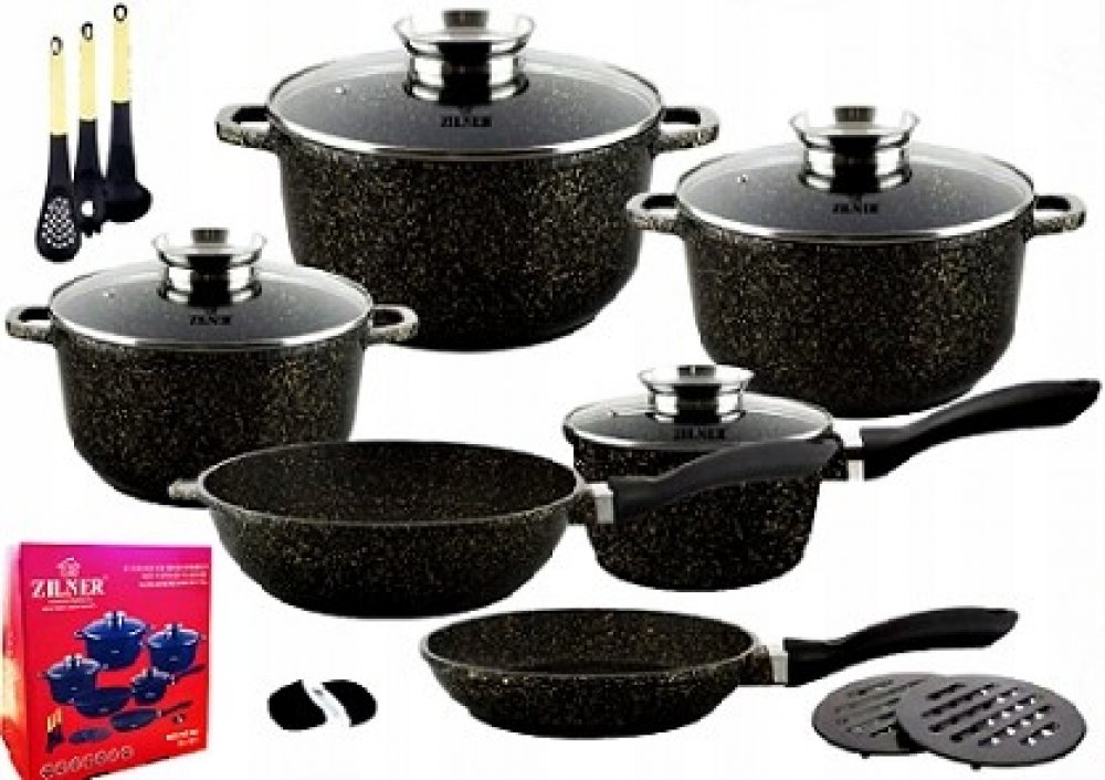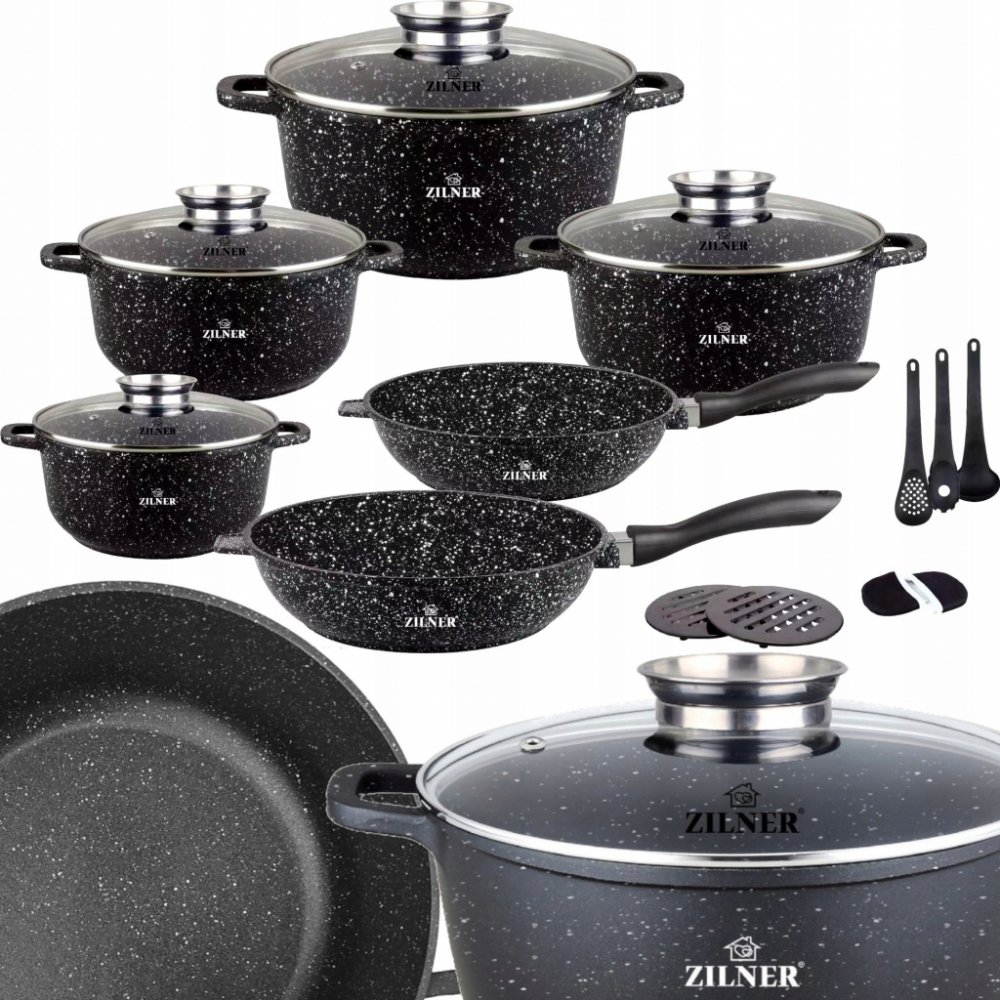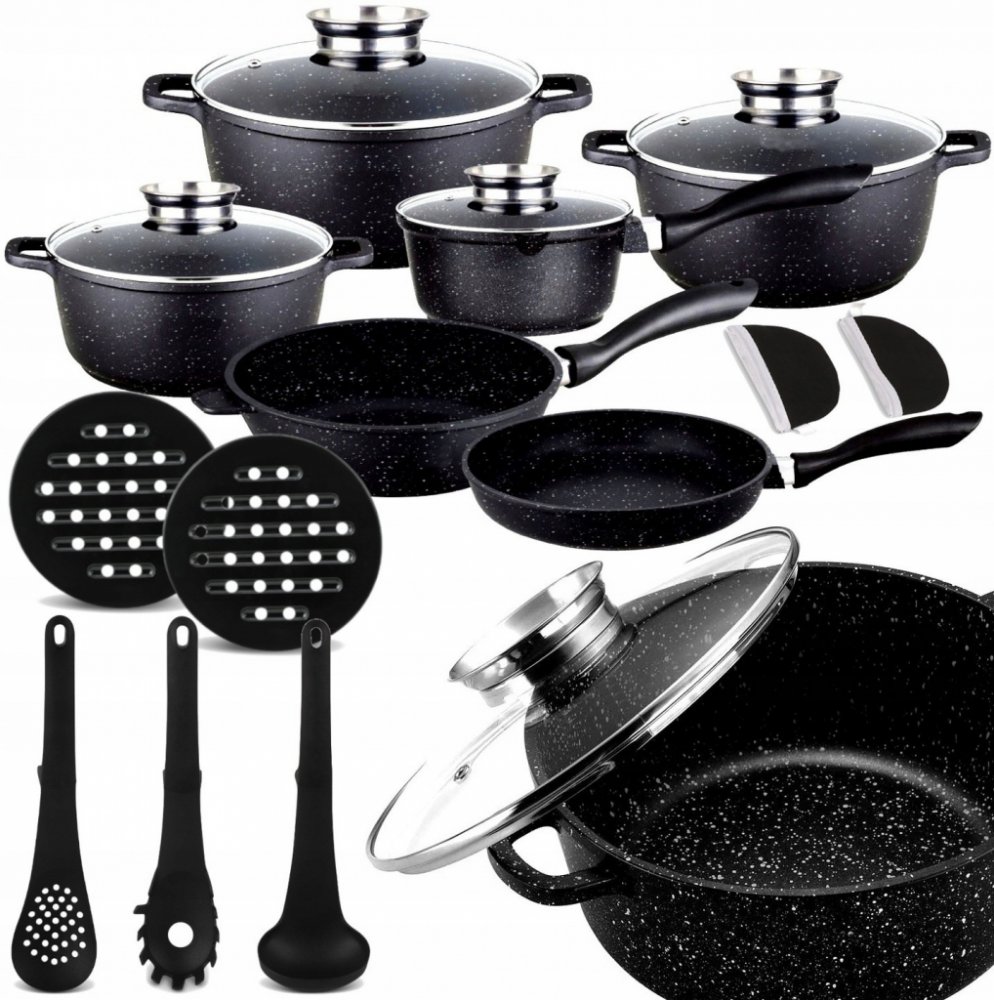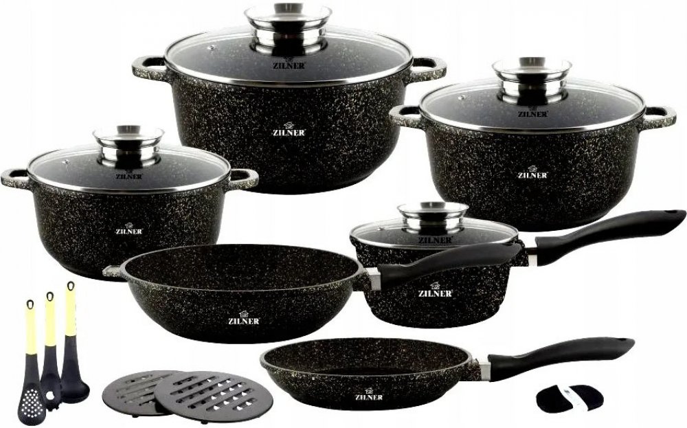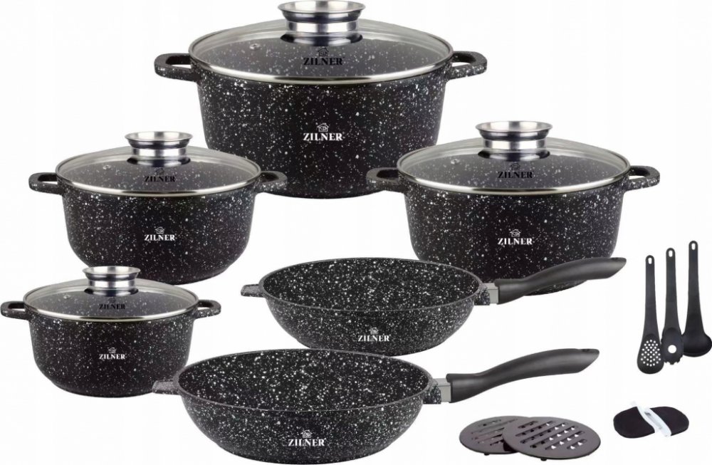 SADA HRNCŮ S KUCHYŇSKÝM NÁČINÍM 17 DÍLNÁS NEPŘILNAVOU GRANITOVOU POVRCHOVOU ÚPRAVOU OD SPOLEČNOSTI ZILNERČERNÁ MRAMOROVÁ SÉRIE ZL-7215