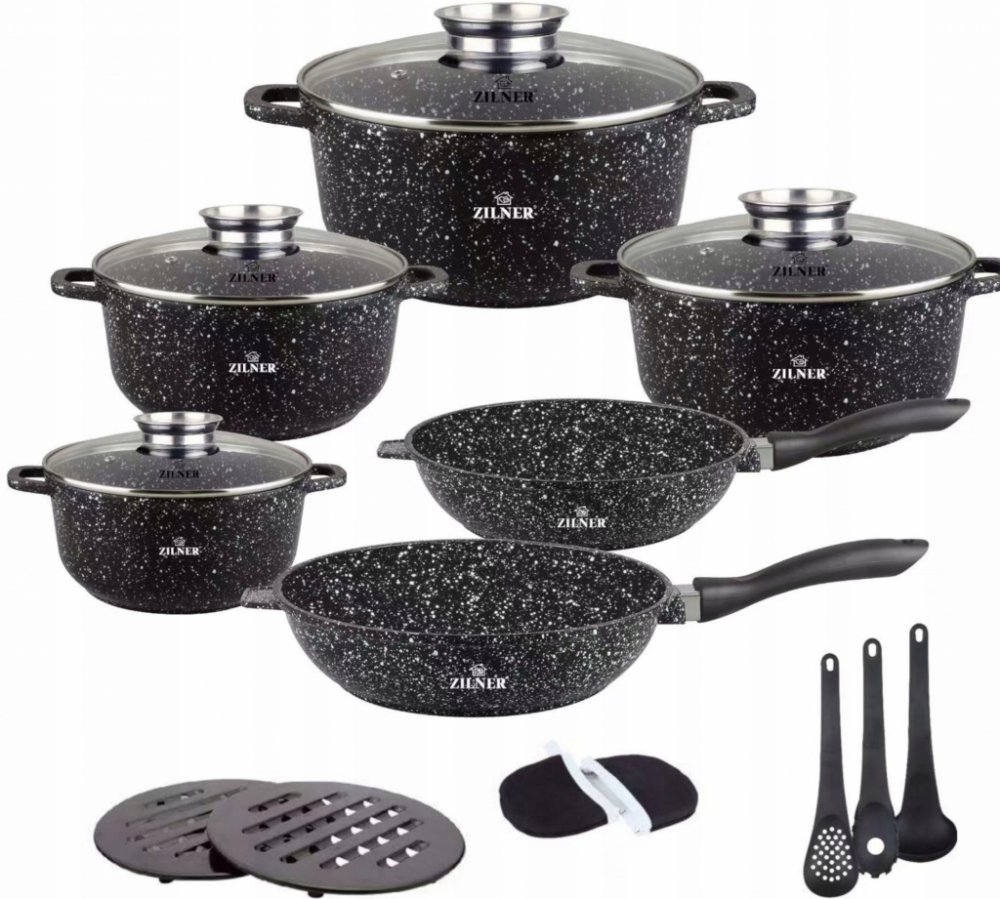 Sada hrnců Zilner Černá Mramorová řada ZL-8518 umožňuje vaření, dušení a smažení s použitím minimálního množství tuku a vody při teplotě do 220°, protože hrnce se zahřívají podobně jako kámen a vydávají teplo celou svou plochou.