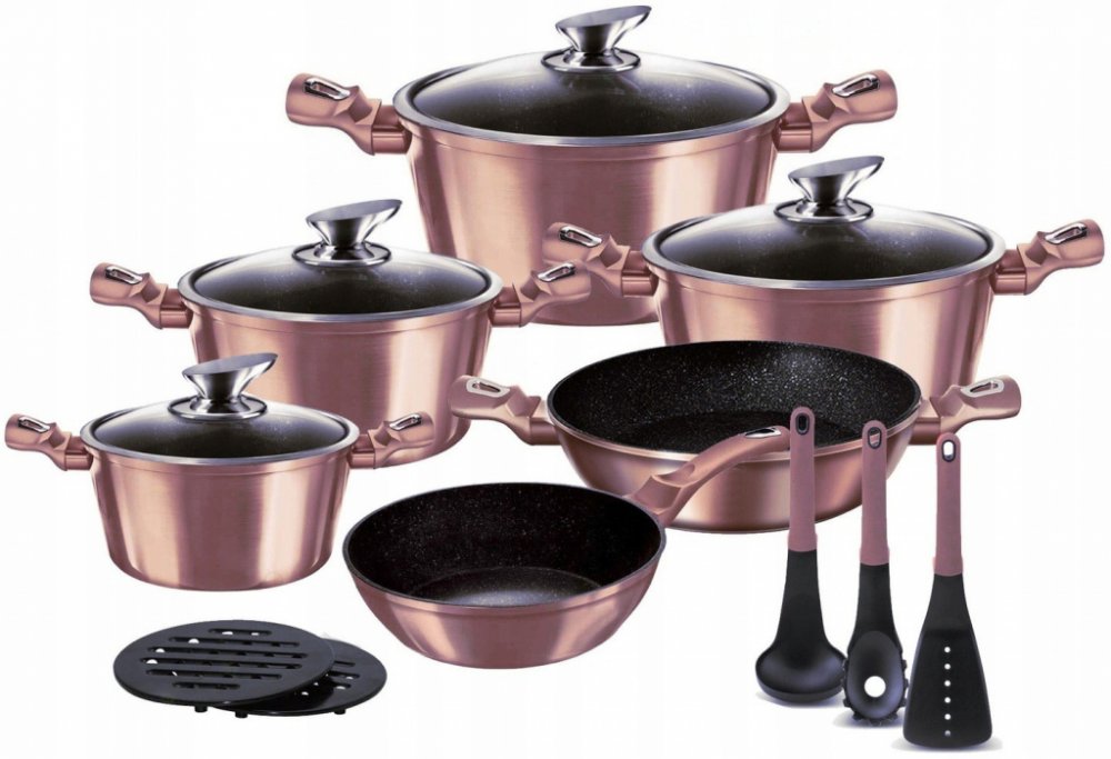 - Sada 15 kusů Vyrobeno z kovaného hliníku a pokryto nepřilnavou vrstvou z keramického mramoru, díky které se potraviny nepřilepí na stěny ani na dno