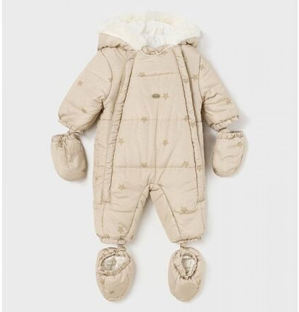 Zimní overal s odepínacími zateplenými botičkami, rukavičkami a kožíškem na kapuci. Dva dlouhé podložené zipy v přední části overalu usnadní oblékání miminka. kvalitní zimní kombinézka z jemného šusťákového materiálu overal má odepínací rukavice a návleky na nožičky na suché zipy kombinézka má krytí krku, které zabrání poškrábání koncem zipů vnitřek kombinézky je z příjemného bavlněného úpletu v rukávech podšívka z jemného silonu pro snadné oblékání tři vrstvy materiálu vrchní materiál: 100% polyester podšívka: 85% bavlna (tělo), 15% polyester (v rukávech) výplň: 100% polyester artikl: Mayoral 2624-60