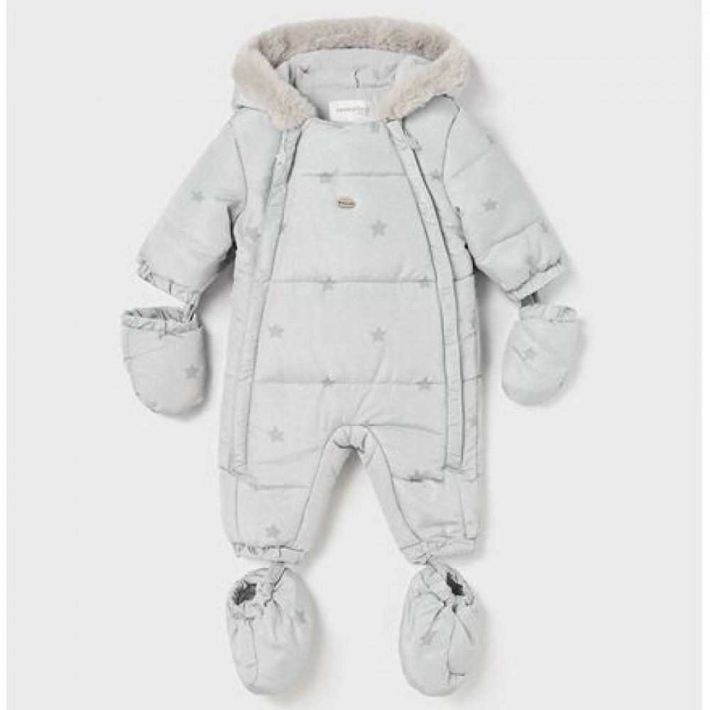 Zimní overal s odepínacími zateplenými botičkami, rukavičkami a kožíškem na kapuci. Dva dlouhé podložené zipy v přední části overalu usnadní oblékání miminka. kvalitní zimní kombinézka z jemného šusťákového materiálu overal má odepínací rukavice a návleky na nožičky na suché zipy kombinézka má krytí krku, které zabrání poškrábání koncem zipů vnitřek kombinézky je z příjemného bavlněného úpletu v rukávech podšívka z jemného silonu pro snadné oblékání tři vrstvy materiálu vrchní materiál: 100% polyester podšívka: 85% bavlna (tělo), 15% polyester (v rukávech) výplň: 100% polyester artikl: Mayoral 2624-61 Luna vig