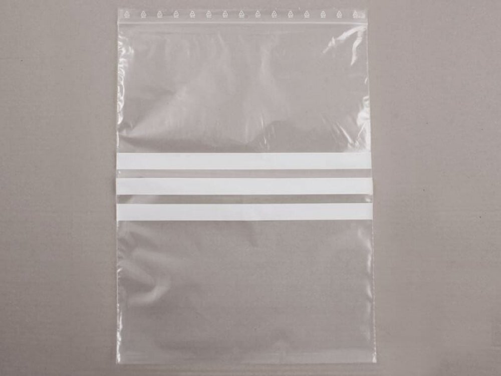 Velké rychouzavíratelné pytlíky 30x40 cm se třemi bílými pruhy pro popisování. Igelitové sáčky vhodné také na potraviny (ATEST). Bílé pruhy mají matnou úpravu a dá se na ně psát běžnou propiskou nebo fixem. Rychlouzavírací sáčky se zipem jsou vhodné k balení zboží v obchodech, dílnách, skladech apod. Plastový zip v horní části sáčku je znovu uzavíratelný, stačí pouze přitlačit obě strany k sobě. Prodej po balení 100 ks. Materiál LDPE.