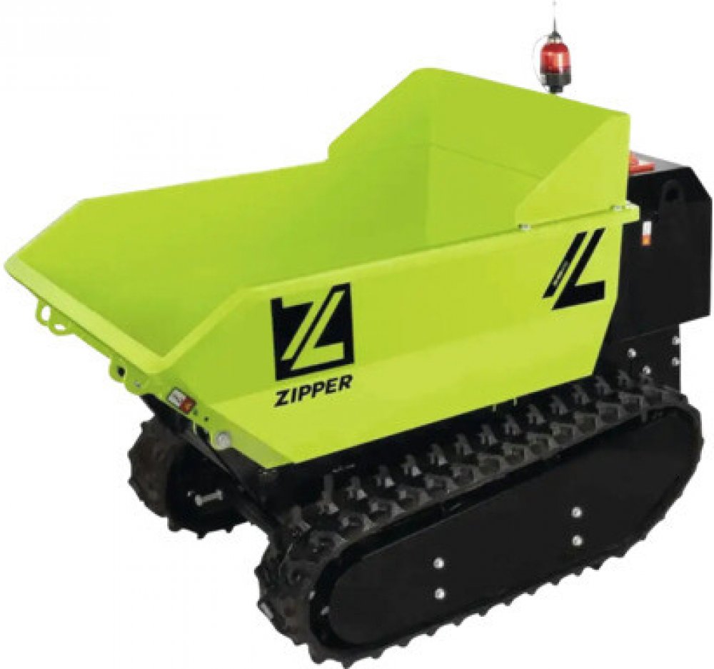 Elektrický sklápěcí vozík s řetězovým pohonem, rádiovým dálkovým ovládáním a hydraulickou funkcí sklápění.