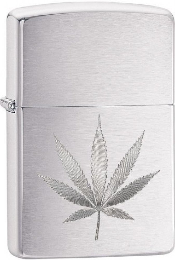 Zippo zapalovač - Broušený chrom s gravírováním lístku konopí