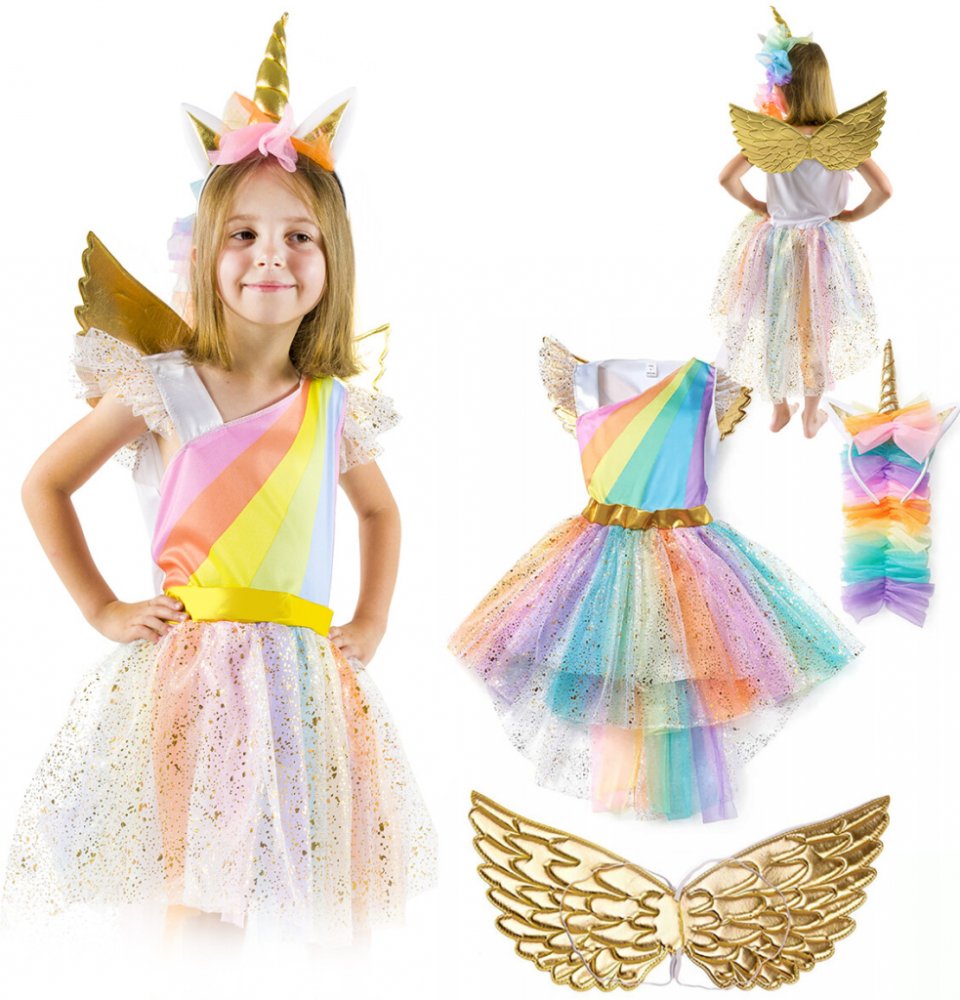 ⚡ SADA, KTERÁ OKOUZLUJE A NADCHNESada obsahuje vše, co charakterizuje okouzlujícího jednorožce – kostýmjistě podnítí fantazii vašeho dítěte! ❤️ jemné, duhové, třpytivé šaty s tylovým, stupňovitým spodkem a zlatým páskem ❤️ zlatákřídla ❤️ bohatě zdobenáčelenkas dlouhým závojem