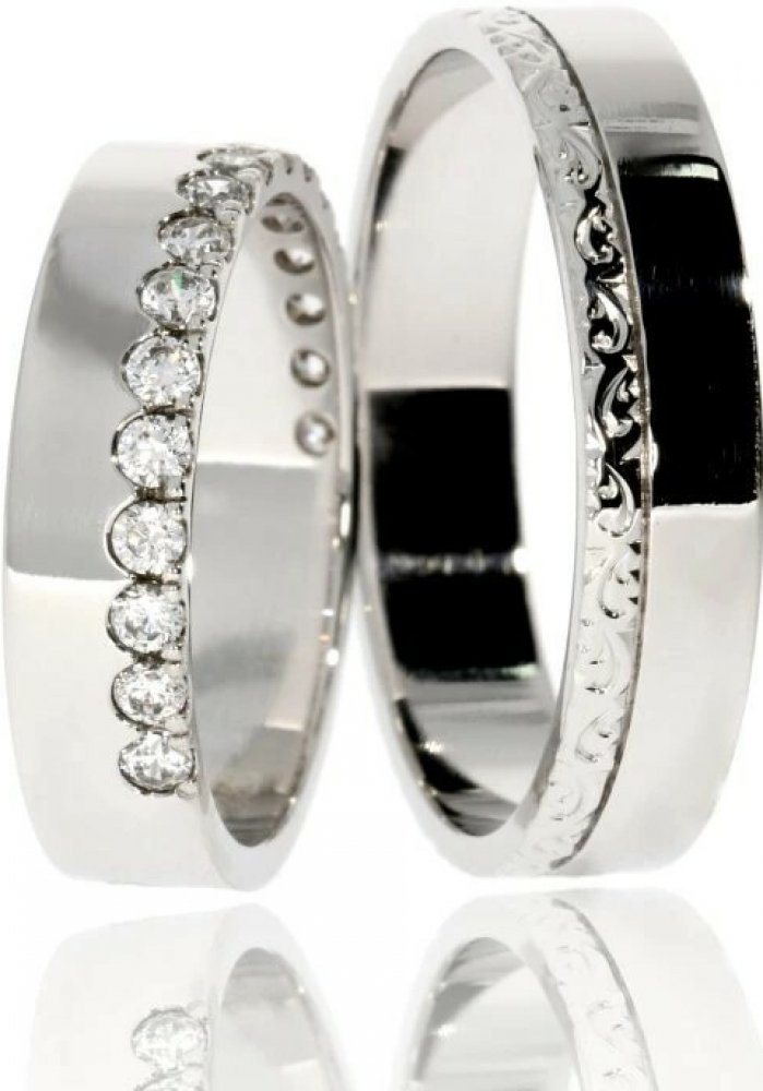 - Stříbrné snubní prsteny, dámský prsten zdobený zirkony, pánský prsten rytím